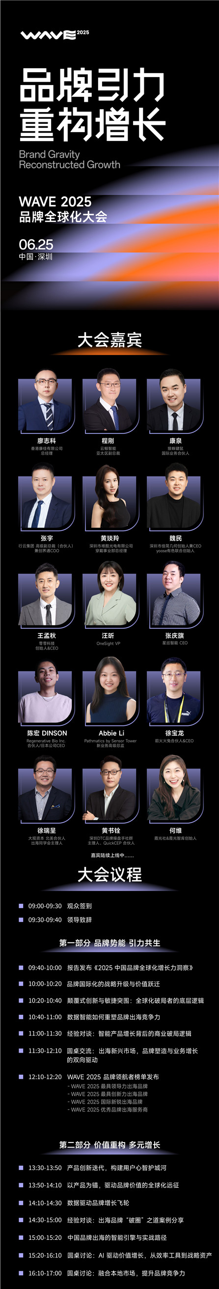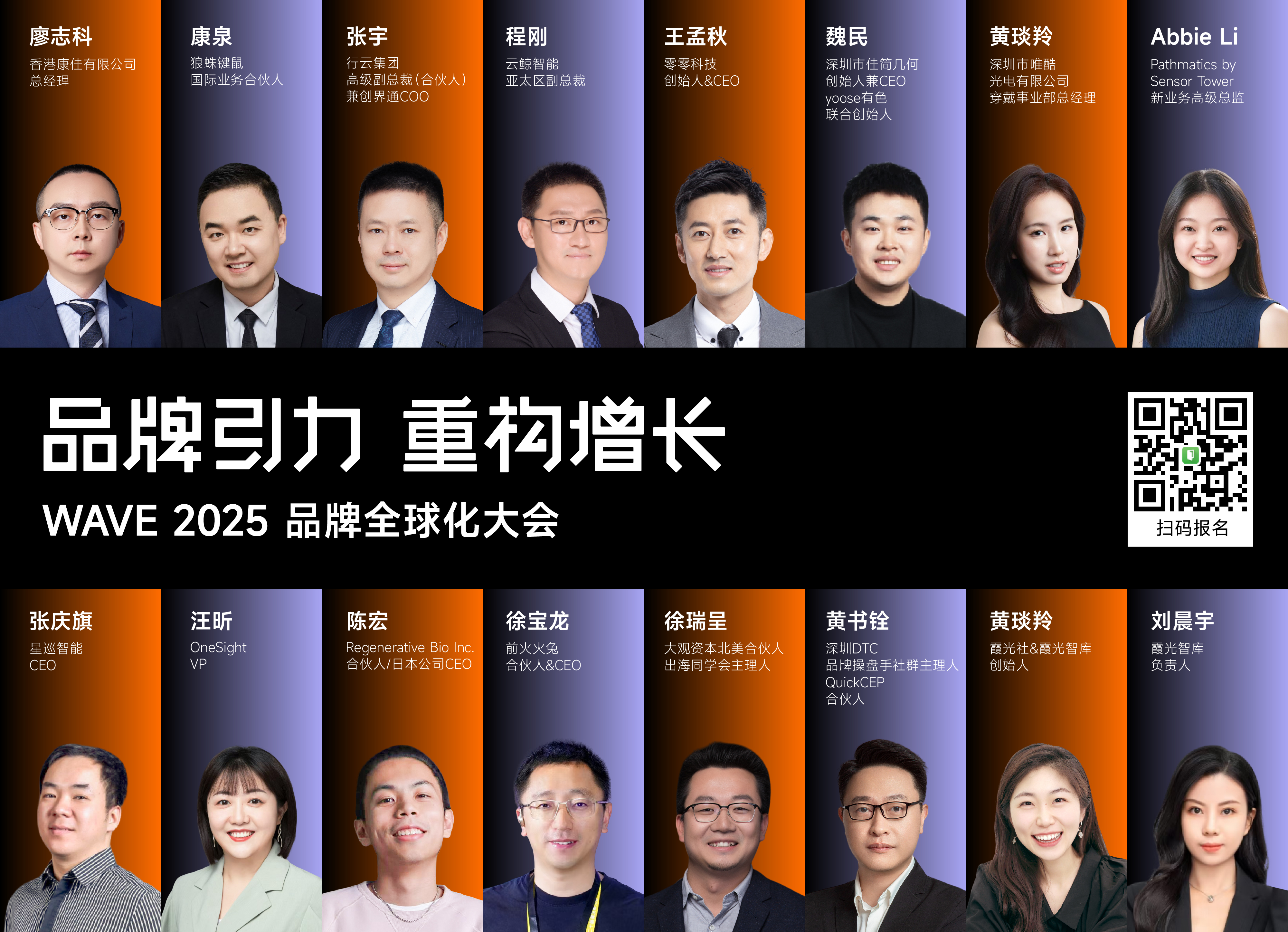 顺应中国品牌出海潮流,霞光社联合霞光智库,将于 6 月 25 日在深圳举办「品牌引力·重构增长 - WAVE2025 品牌全球化大会」,聚焦全球市场格局变化与产品增长方法论,汇聚品牌全球化领航者、投资机构及海内外头部媒体,通过深度对话与实战经验分享,为中国品牌在全球市场的价值跃升提供破局思路。