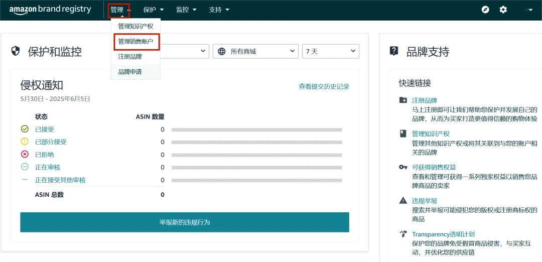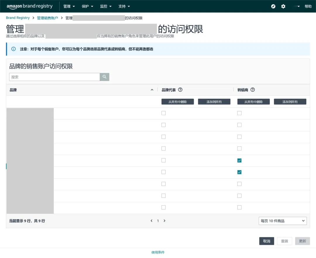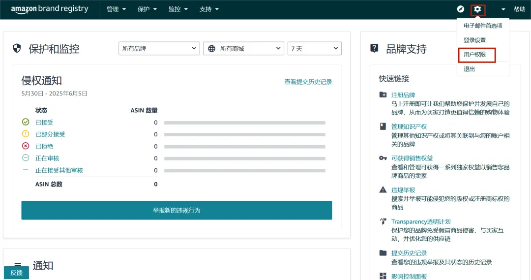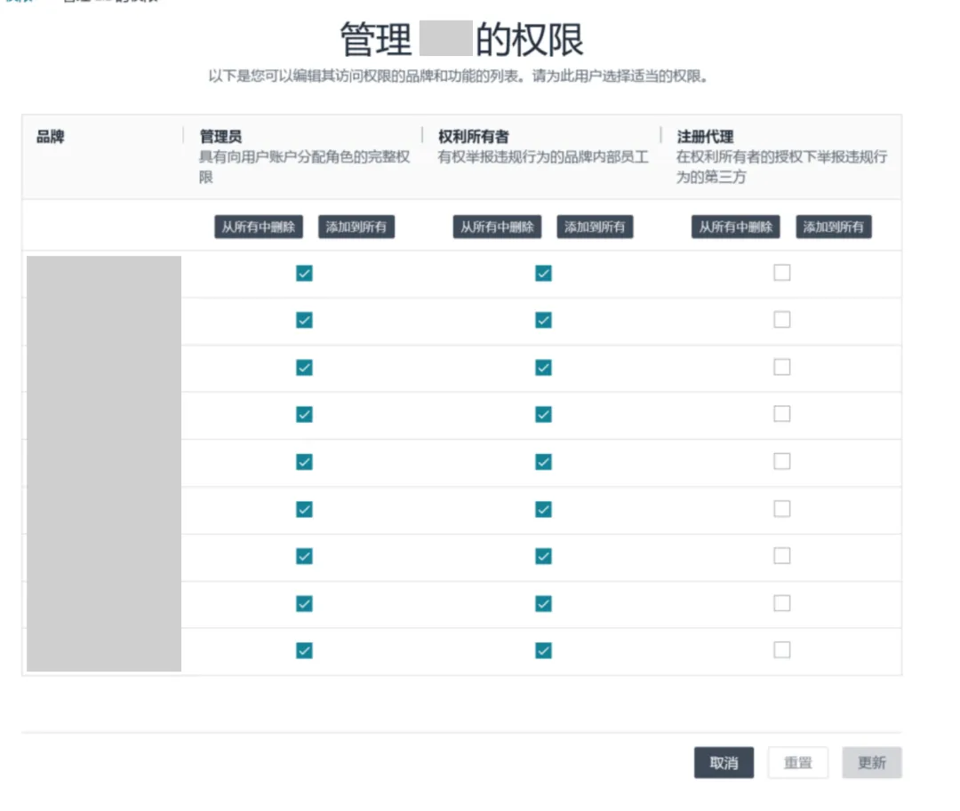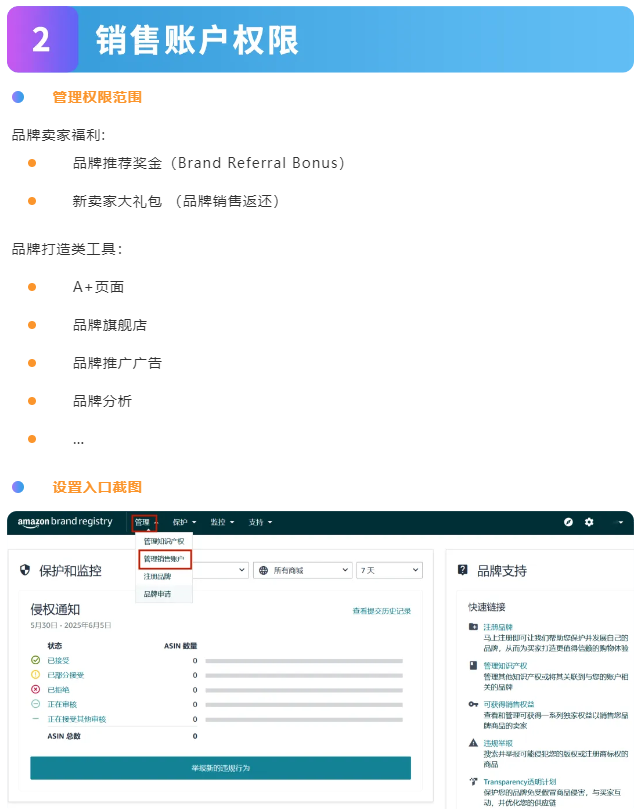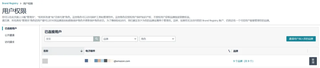 如果您当前是管理员,建议您立即登录进品牌注册后台查看自己是否能够更新角色权益,以及当前角色权益分配是否已是更新且准确的。管理员可以通过访问品牌注册平台中的用户权限或管理销售账户工具来查看分配给其品牌的角色。