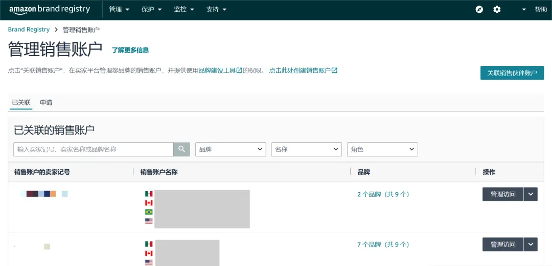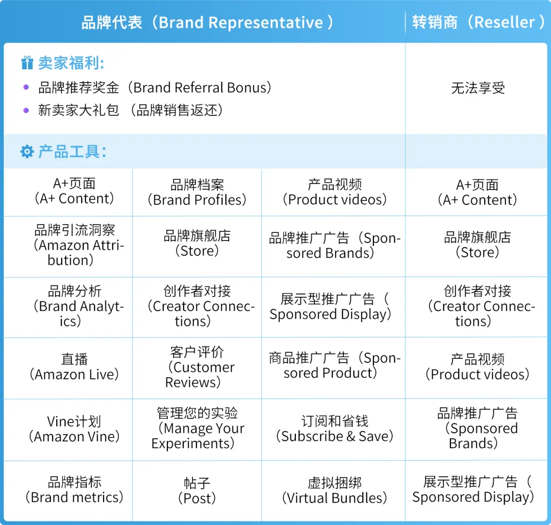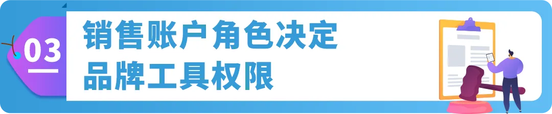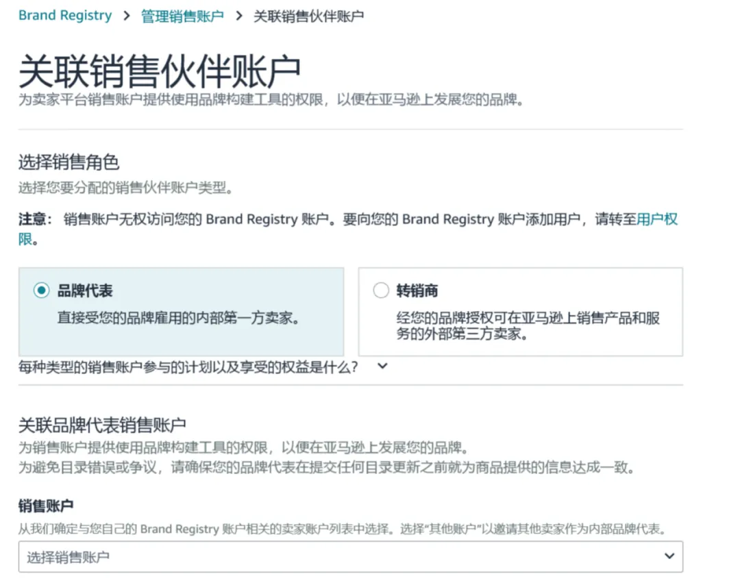 销售账户权限:分为“品牌代表”和“转销商”角色。这些角色为卖家平台销售账户提供使用品牌构建工具的权限,以便在亚马逊上发展您的品牌。