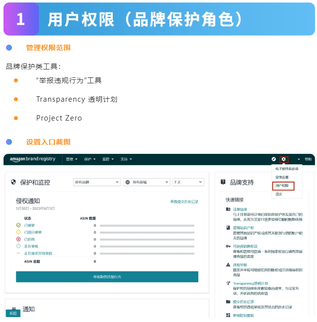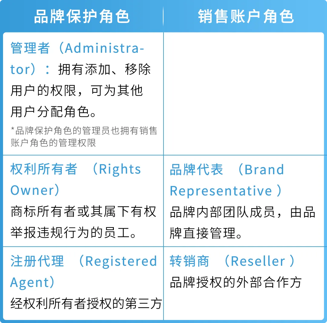 用户权限:分为“管理员”、“权利所有者”和“注册代理”角色。这些角色可以访问保护工具和管理控件。这些角色仅授权用户保护知识产权,不授权用户获取品牌独家销售权益。