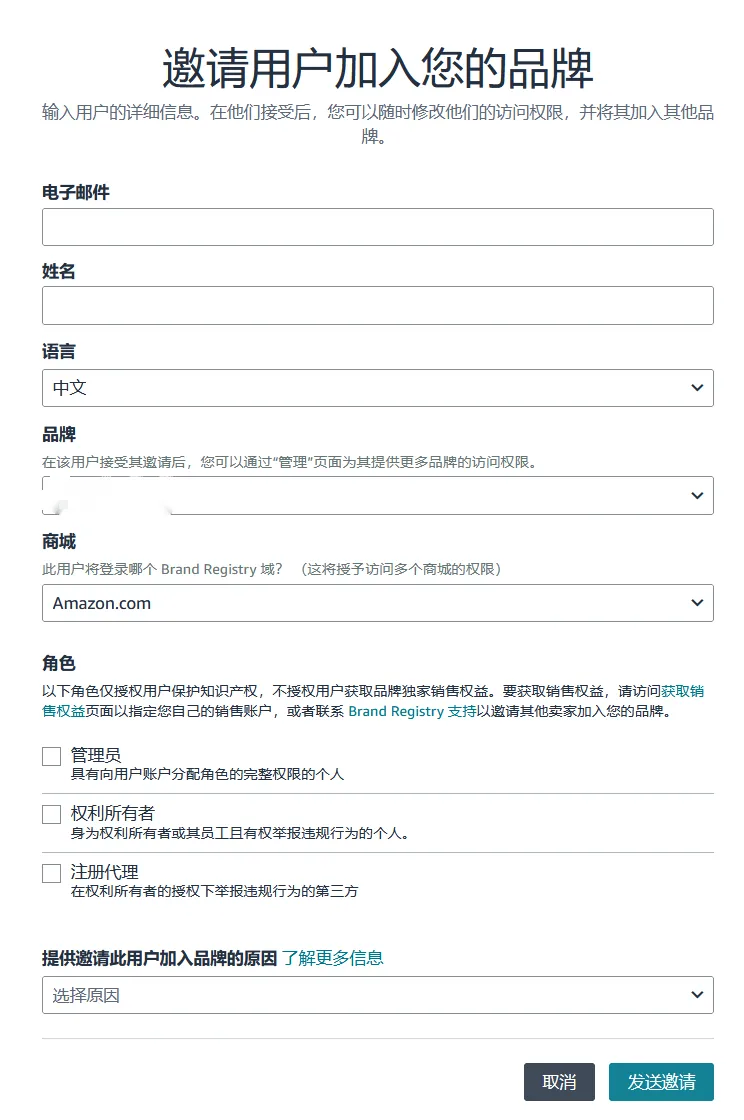 如果您要添加新用户,请点击:邀请用户加入您的品牌,输入所需信息,勾选想要分配的品牌保护角色,点击“发送邀请”。您可以按需将任意数量的用户账户添加至您的品牌。