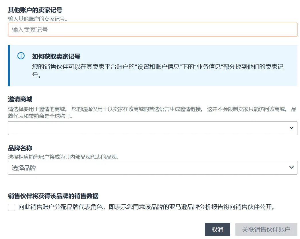如果您要添加新用户,请点击:关联销售伙伴账户→ 选择卖家平台账户 → 根据合作关系选择角色(品牌代表/转销商)。您可以从Brand Registry 账户相关的卖家账户列表中选择或者选择“其他账户”以邀请其他卖家作为内部品牌代表。
