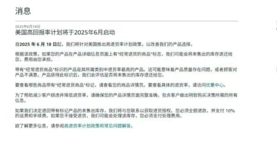 亚马逊将于2025年6月18日 正式在美国市场推出High Return Rate Program(高退货率商品管理计划),减少劣质商品的流通,提升整体客户体验。