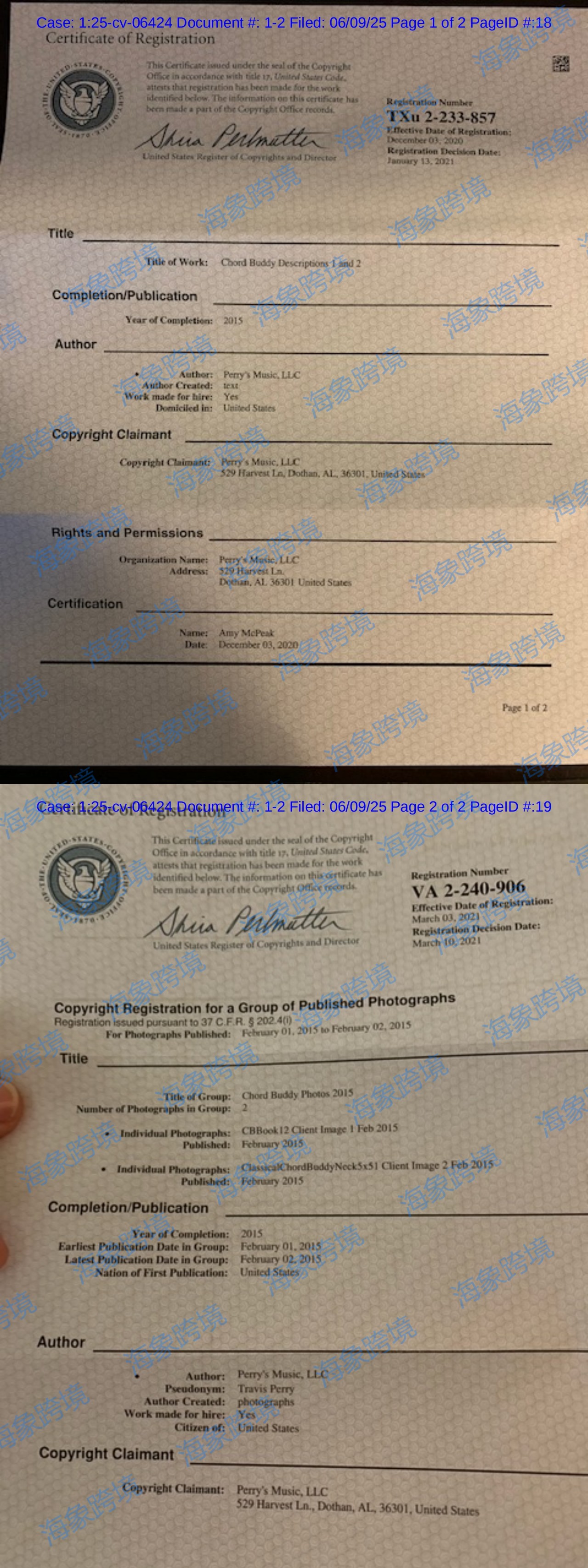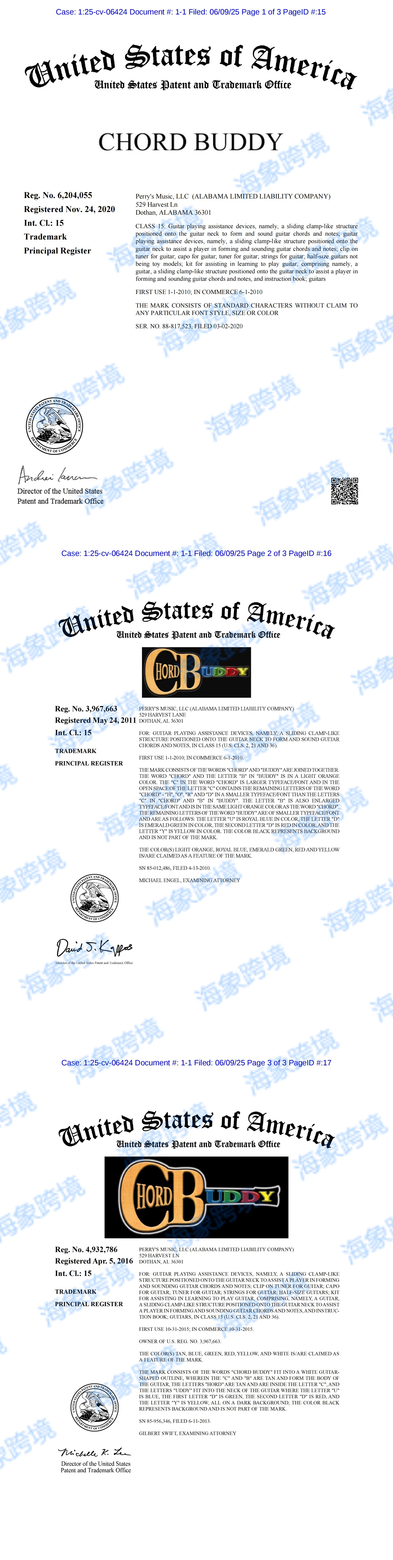 ●案件参数: 起诉时间:2025/6/9 案件号:25-cv-6424 原告品牌:CHORD BUDDY 吉他和弦辅助器 品牌方:Perry’s Music LLC 律所:David 起诉地:美国伊利诺伊州 注册版权和商标: 原告从事制造、分销和零售高品质音乐配件的业务,例如 CHORD BUDDY,一个帮助用户学习弹吉他和弦的辅助设备品牌。本案为商标+版权双重维权,版权图片未公开官网产品图均有侵权风险,请售卖相关产品卖家注意排查避雷! 案件进展: 刊登实例: