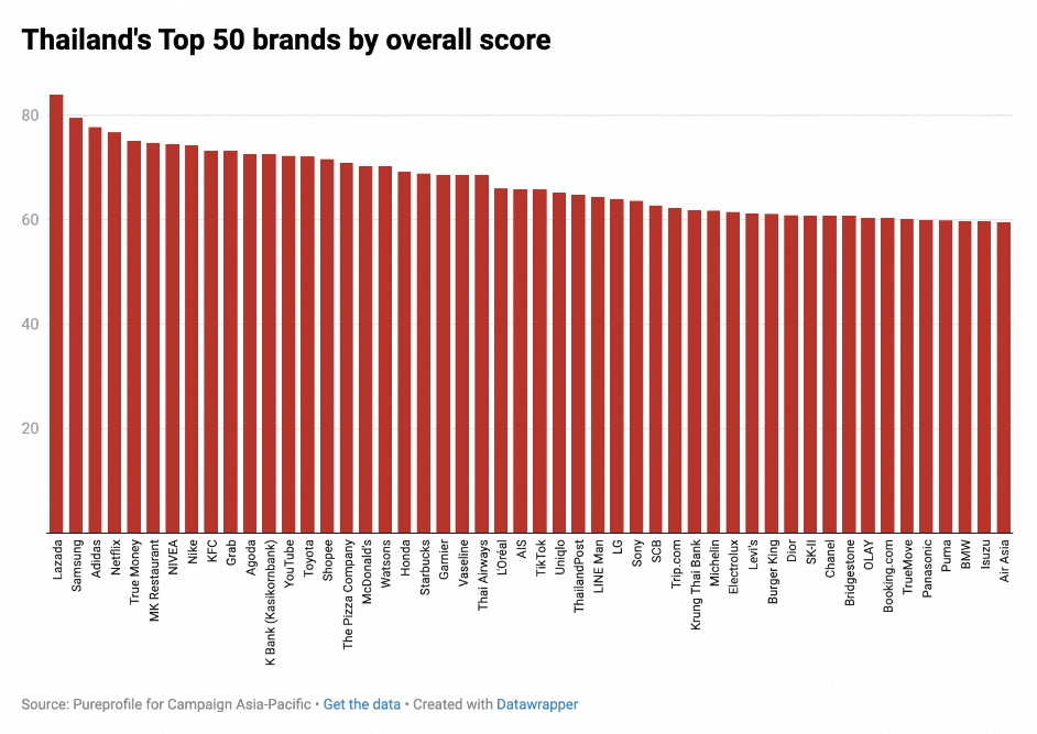 近期,知名媒体Campaign与市场研究机构Pureprofile联合发布了《2025年最受欢迎的品牌榜》排名,Lazada在泰国超越Shopee成为“最受消费者喜爱的品牌”。