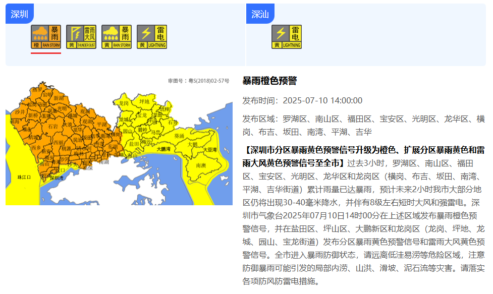 【深圳市分区暴雨黄色预警信号升级为橙色、扩展分区暴雨黄色和雷雨大风黄色预警信号至全市】过去3小时,罗湖区、南山区、福田区、宝安区、光明区、龙华区和龙岗区(横岗、布吉、坂田、南湾、平湖、吉华街道)累计雨量已达暴雨,预计未来2小时我市大部分地区仍将出现30-40毫米降水,并伴有8级左右短时大风和强雷电。深圳市气象台2025年07月10日14时00分在上述区域发布暴雨橙色预警信号,并在盐田区、坪山区、大鹏新区和龙岗区(龙岗、坪地、龙城、园山、宝龙街道)发布分区暴雨黄色预警信号和雷雨大风黄色预警信号。全市进入暴雨防御状态,请远离低洼易涝等危险区域,注意防御暴雨可能引发的局部内涝、山洪、滑坡、泥石流等灾害。请落实各项防风防雷电措施。