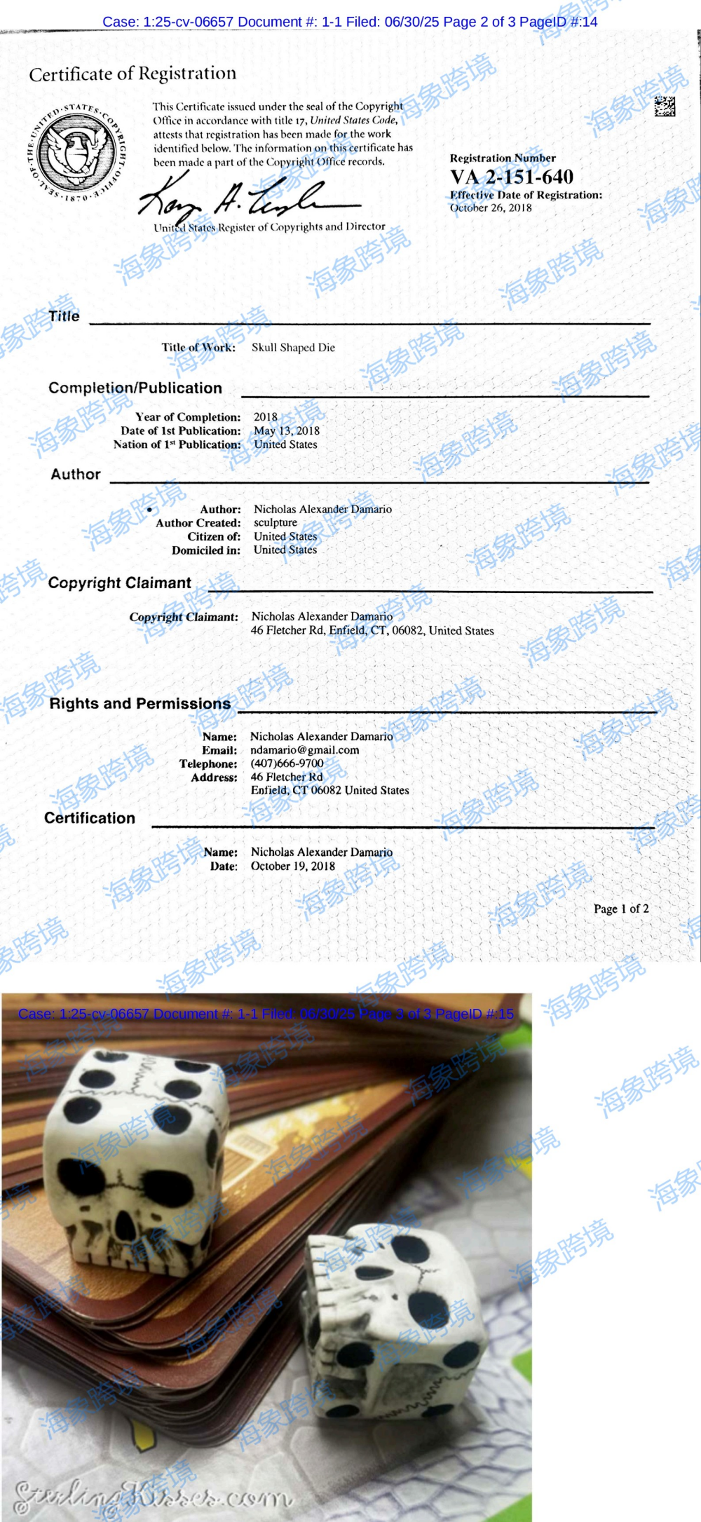 达马里奥是一位来自康涅狄格州的专业艺术家,其作品多将恐怖元素与实用物品相结合,案件涉及产品是一款造型独特的骷髅骰子,请相关卖家注意排查避雷!