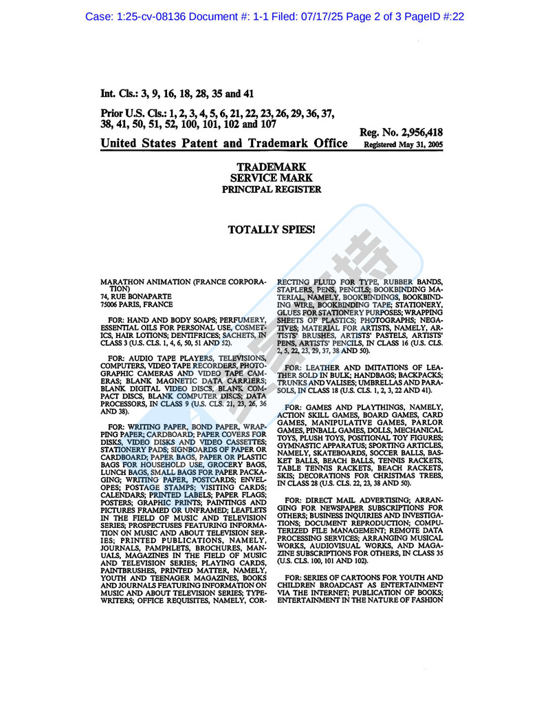 本案是HSP近期代理的一起全新TRO维权案件,品牌方是法国娱乐公司Zodiak Kids Studio France ,针对其热门IP:Totally Spies!间谍少女组发起的商标&版权维权,其商标涵盖洗护用品、玩具、游戏、印刷品、包以及音频等多个领域,跨境卖家速速排查下架!