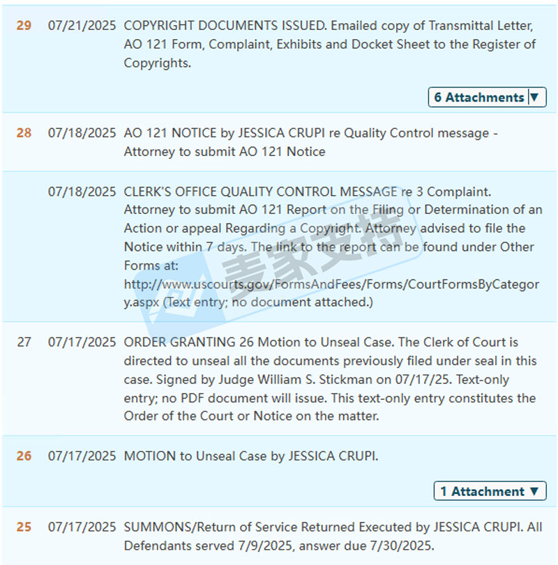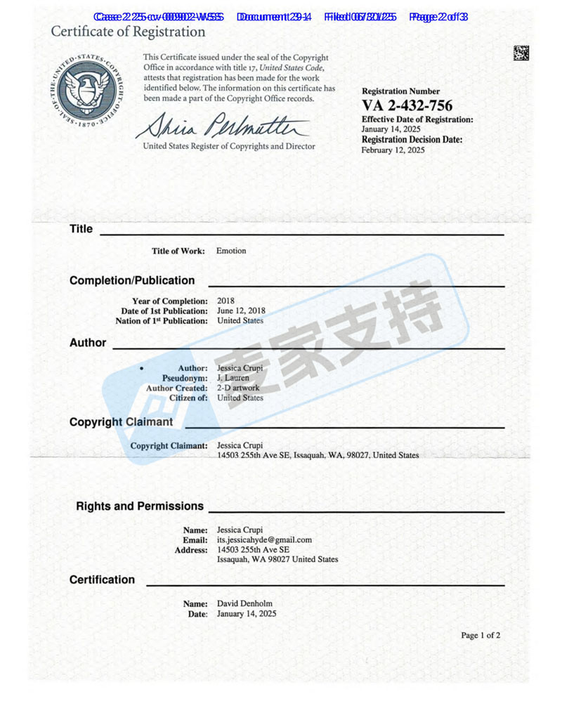 本案是Ference 代理Jessica Crupi于6月30日在宾夕法尼亚州发起的版权维权,涉案版权创作于2018年6月,并于2025年1月14日获得美国版权认证,版权号为:VA 2-432-756。该图片被广泛用于服饰花纹中,目前已有60店涉案并成功取证,跨境卖家在选品时需注意规避!