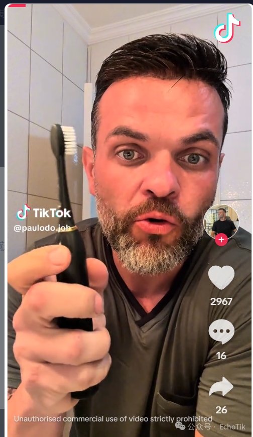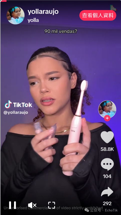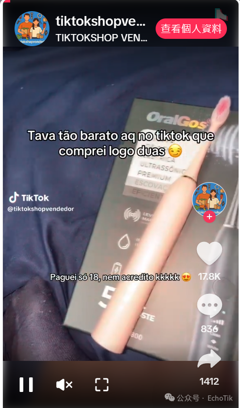 在平台上,Happy Loja 的带货视频堪称 “教科书级示范”:镜头里,巴西博主举着电动牙刷对着镜头微笑,按下开关的瞬间,刷头高频震动的特写搭配泡沫飞溅的画面,再配上 “3 分钟自动计时,比手动刷牙干净 10 倍” 的葡萄牙语旁白,简单直接却极具说服力。其中一条展示 “敏感牙龈专用模式” 的视频,更是创下 108.4k 的点赞量,评论区里满是 “在哪买”“求链接” 的呼声。