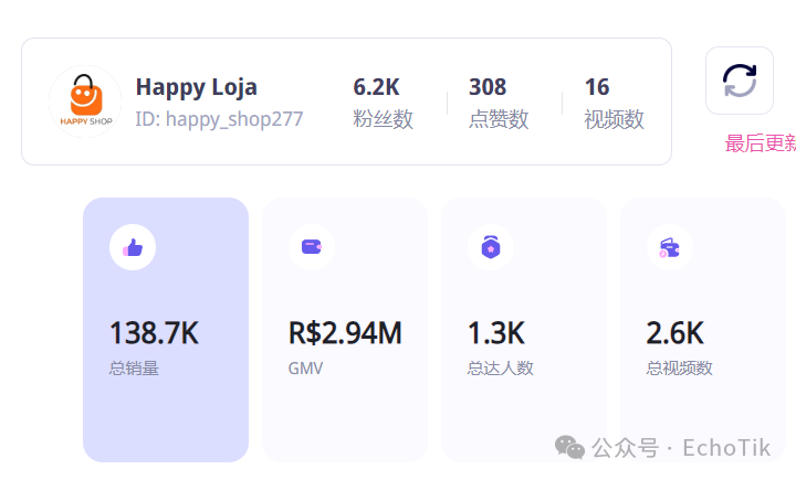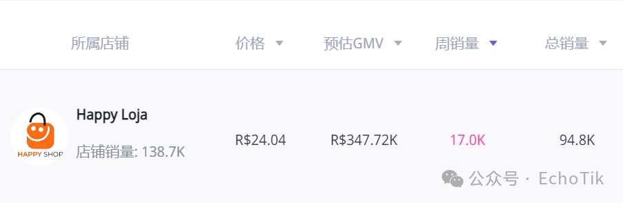 这种 “场景化 + 实用性” 的内容打法,让 Happy Loja 的销量一路狂飙:总销量突破 138.7K,预估 GMV 达 2.94M 雷亚尔,最近 30 天的销量更是占到总销量的 78%,周销量几乎是第二名的一半。更值得注意的是,在它的销量构成中,达人带货贡献了 21.27% 的份额,这意味着除了自有账号运营,Happy Loja 还精准撬动了本地 KOL 资源,形成 “店铺自播 + 达人分销” 的双引擎驱动。