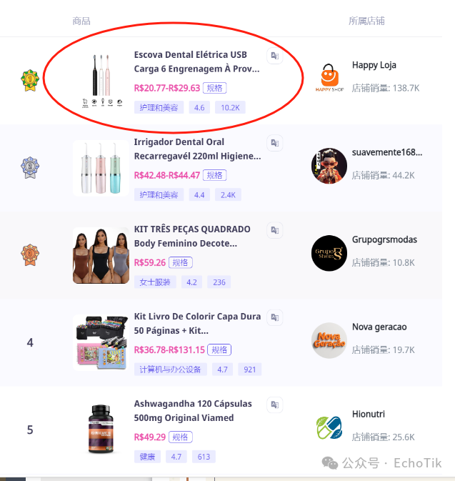 这片拥有 2 亿 TikTok 用户的土地上,人们每天平均花 90 分钟刷手机,指尖划过的不仅是短视频,更是源源不断的消费欲望。而在无数爆火的商品中,一支看似普通的电动牙刷,竟成了撬动千万生意的钥匙 —— 本地卖家 Happy Loja 靠它在 30 天狂销 10.85 万件,狂揽 226 万雷亚尔(约合人民币 300 万 +),硬生生把 “护理美容” 这个赛道跑出了加速度。