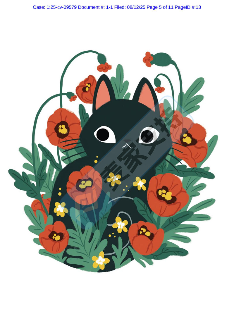 本案是keith律所代理加拿大艺术家Michelle Nicole Simpson发起的跨境维权,涉案版权号分别为:VA 2-423-087、VA 2-423-079、VA 2-423-280、VA 2-423-662和VA 2-423-317等5个版权作品,均于2024年10月17日获得美国版权认证,该系列作品大部分与花丛中的猫有关,被广泛用于家居装饰、珐琅产品、服饰等领域,未经授权则会面临TRO冻结风险。目前该案件处于前期立案阶段,暂未获批TRO临时限制令,跨境卖家速排查下架,关注我们获取案件最新进展!