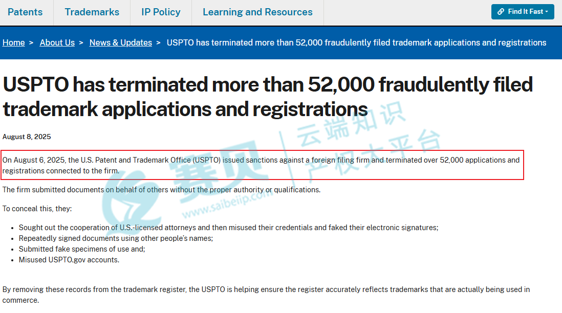 美国专利商标局(USPTO)于2025年8月6日发布《最终制裁令》,针对被制裁方代理的5.2万件商标作出终局裁决,撤销相关注册商标、终止未决程序,并对涉事主体实施永久禁令。这一举措堪称USPTO历史上规模罕见的知识产权合规整治行动,引发跨境电商行业震动。