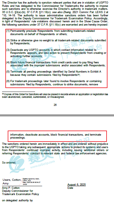 制裁核心:5.2万件商标“清零”,多项禁令即时生效 根据文档中《最终制裁令》的内容,USPTO 对被申请人(被制裁方)采取的制裁措施包括: • 永久禁止被申请人代表自身或他人提交任何商标相关文件; • 对被申请人提交的所有商标相关文件不予认可(即 “Strike or otherwise give no weight”); • 停用任何与被申请人相关的 USPTO 账户,并采取措施阻止其创建或激活新账户; • 阻止与不当提交相关或与被申请人相关的信用卡进行未来的金融交易; • 终止附件 A 中所列序列号对应的所有未决程序; • 对于日后发现涉及被申请人或包含其提交文件的商标程序,继续采取剔除文件、删除信息、停用账户、阻止金融交易和终止程序等措施 (图片来源:USPTO官网2025年8月6日发布的《最终制裁令》) 此次制裁涉及的5.2万件商标覆盖广泛,包括已注册成功的商标及未决申请。USPTO 明确指出,这些商标因存在严重违规行为,其注册证书或审查决定自始无效,即便此前通过审查,也将被彻底推翻。