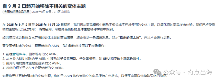 在此期间卖家需要按照亚马逊的要求,及时对使用了将被移除变体主题的产品进行调整。