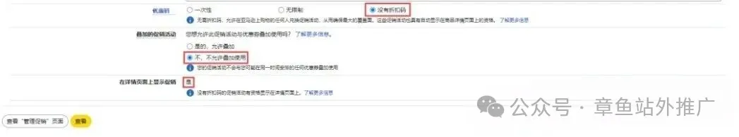 错误 1:优惠券与满减未设置 “不叠加”若未勾选 “不与其他促销叠加”,买家可能同时使用 “小额优惠券 + 满减”,比如 “9.5 折 + 9 折 = 8.55 折”,远超预期折扣,导致利润压缩。需在创建优惠券和满减时,均选择 “不允许叠加”。