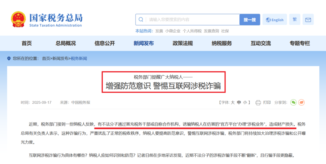 税务部门称,最近频繁接到一些纳税人反映,有不法分子通过冒充税务干部、税务合作机构,诱骗纳税人在仿冒的“税务官方平台”办理涉税业务,给纳税人造成了财产损失。