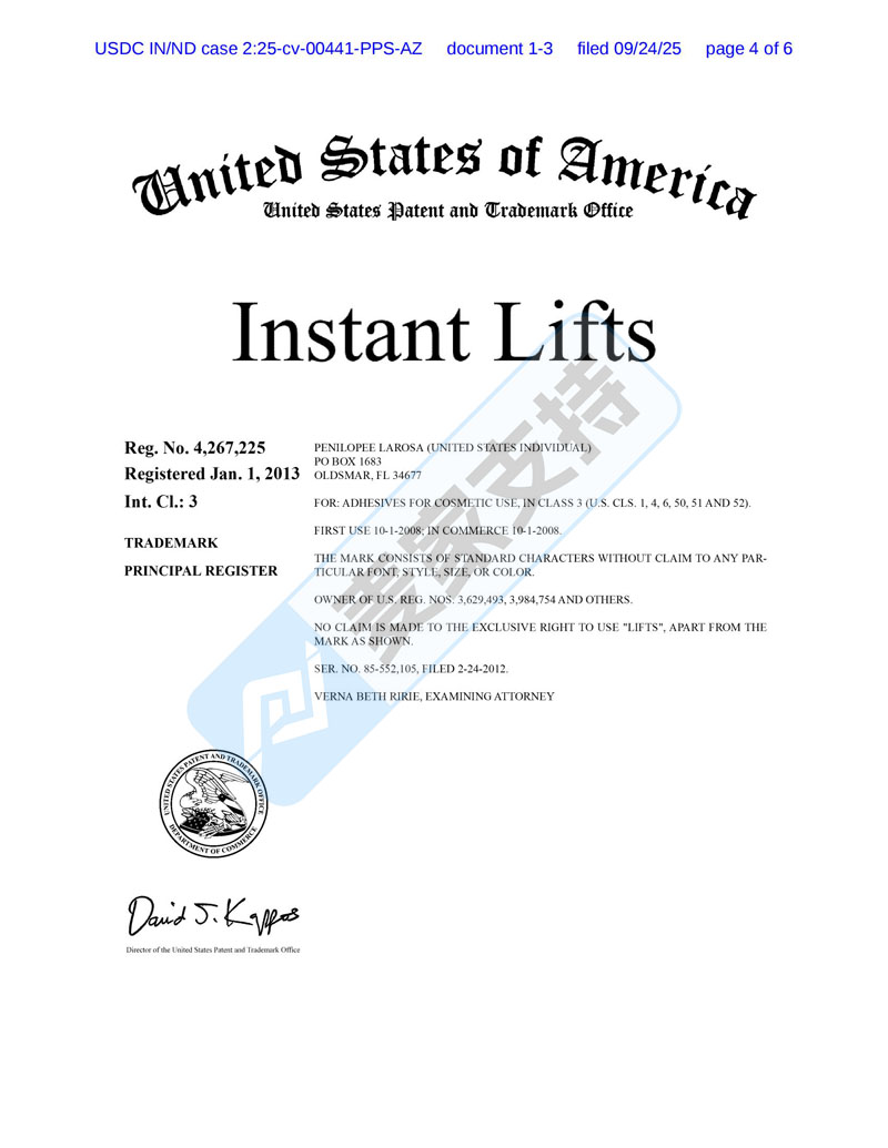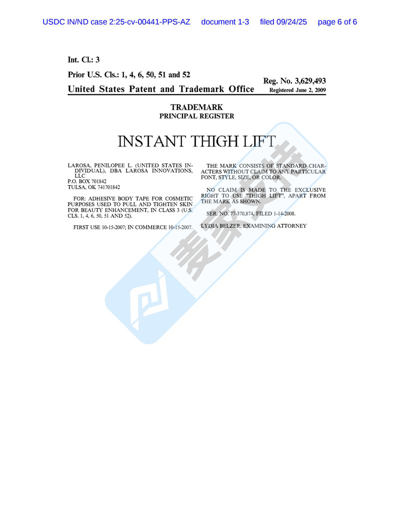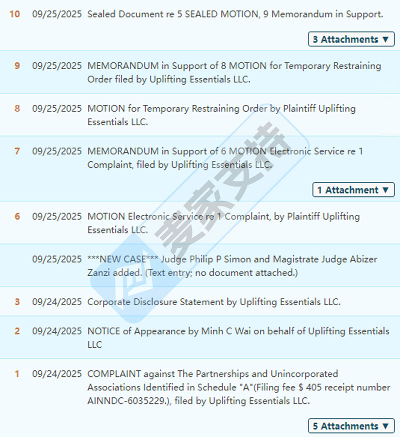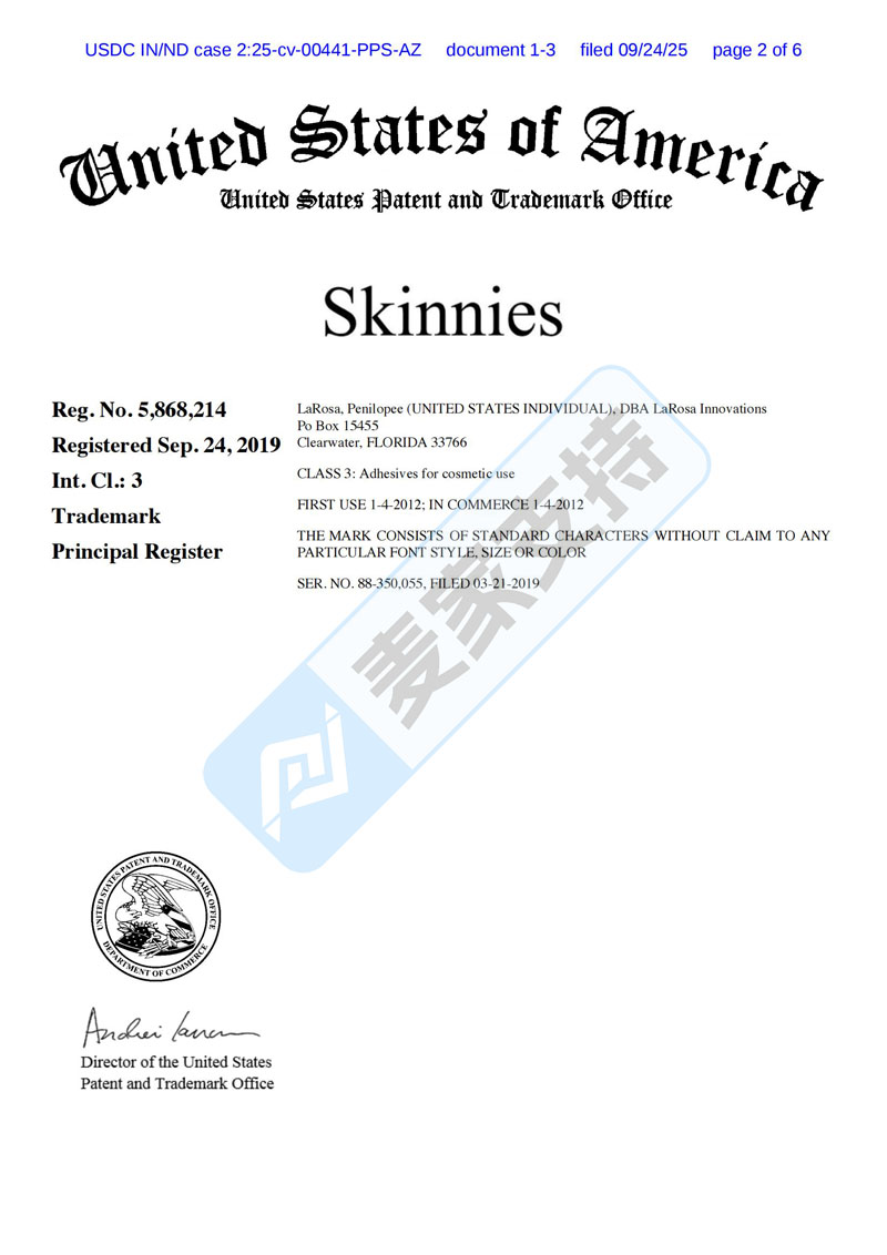 本案是Quintairos,Prieto,Wood & Boyer,P.A代理Uplifting Essentials LLC在印第安纳州北区地方法院发起的商标维权案件,共涉及Skinnies、Instant Lifts 以及Instant thigh Lift等三个商标,商标号分别为:5868214、4267225以及3629493等,均注册在第3大类,涵盖化妆品粘合剂类目。未经授权这三个商标词,则会面临TRO冻结风险,目前该案件处于前期立案阶段,暂未获批TRO临时限制令,跨境卖家应尽快展开全面排查。