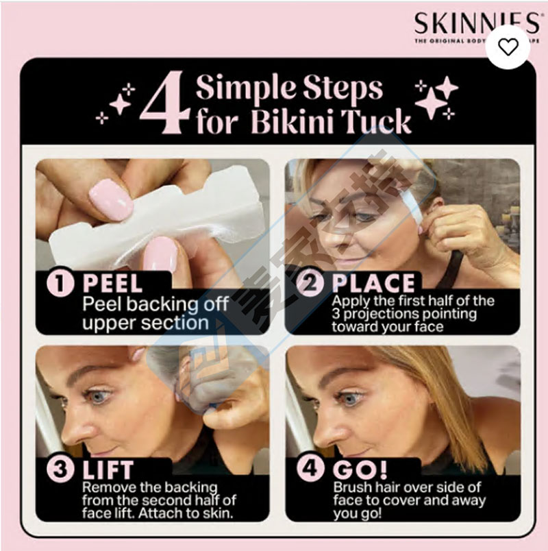 Skinnies Instant Lifts 贴片是一款能够轻松提拉、抚平皱纹,且无痛的提拉产品,主打即时提拉与塑形效果,专为解决皮肤松弛、橘皮组织及局部脂肪堆积问题设计;通过透明、无夹感的粘性设计,实现全天舒适佩戴,同时具备防汗功能,适合多种场合使用。自2007年问世以来,Uplifting Essentials LLC持续拓展产品线,推出多款针对性身体护理方案,帮助女性无需通过手术即可提升外在形象与自信心。