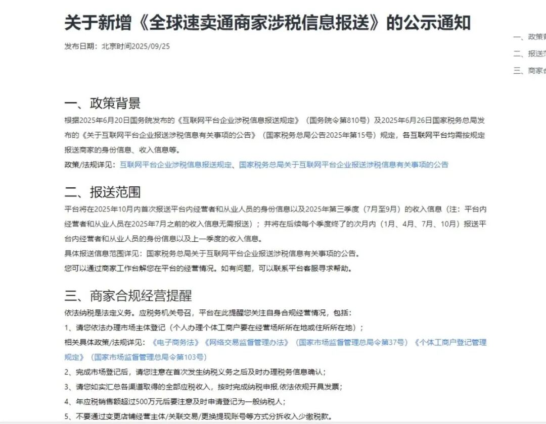 跨境电商圈内讨论多时的《互联网平台企业涉税信息报送规定》(以下简称《规定》)终于落地执行。速卖通、Shein等多个出口跨境电商平台向卖家发布通知,平台将在2025年10月内首次报送平台内经营者及从业人员的身份信息和三季度的收入信息。跨境电商行业内经营数据,将会逐步透明化。