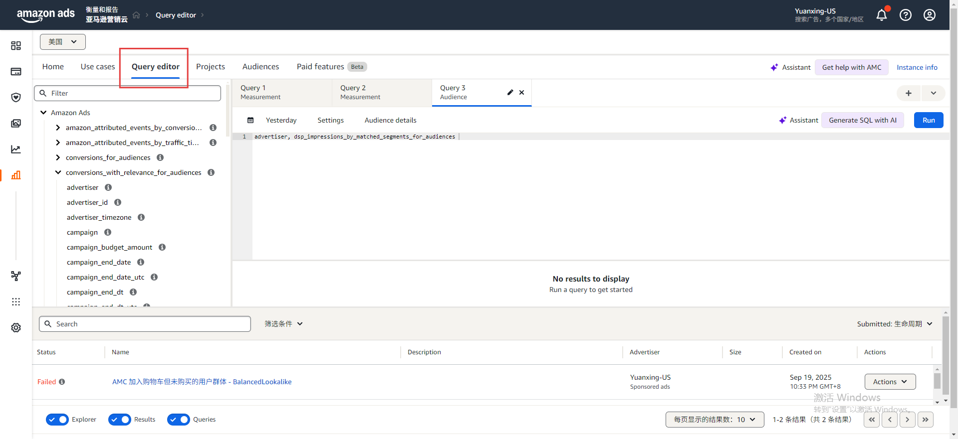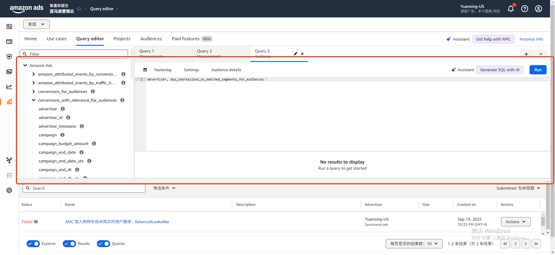 核心界面为可自定义操作的SQL编辑器,卖家可根据自身业务目标(如特定广告效果核算、用户行为追踪等),自主调用AMC中的不同数据表
