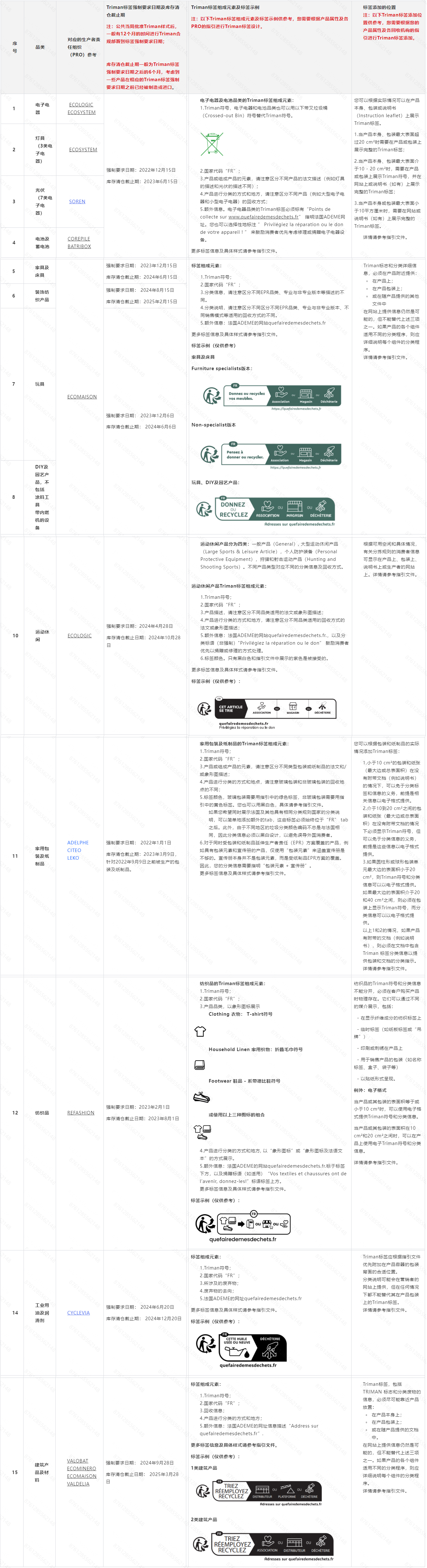 根据法国环境法(AGEC)第 L541-9-3条,任何受到法国生产者责任延伸(EPR)约束的产品(除饮料玻璃瓶外)均须贴有分类标签,告知消费者该产品使用的分类规则对象。这些产品包括包装、电子电器、电池及蓄电池、家具、玩具、DIY及园艺产品、纺织品等。