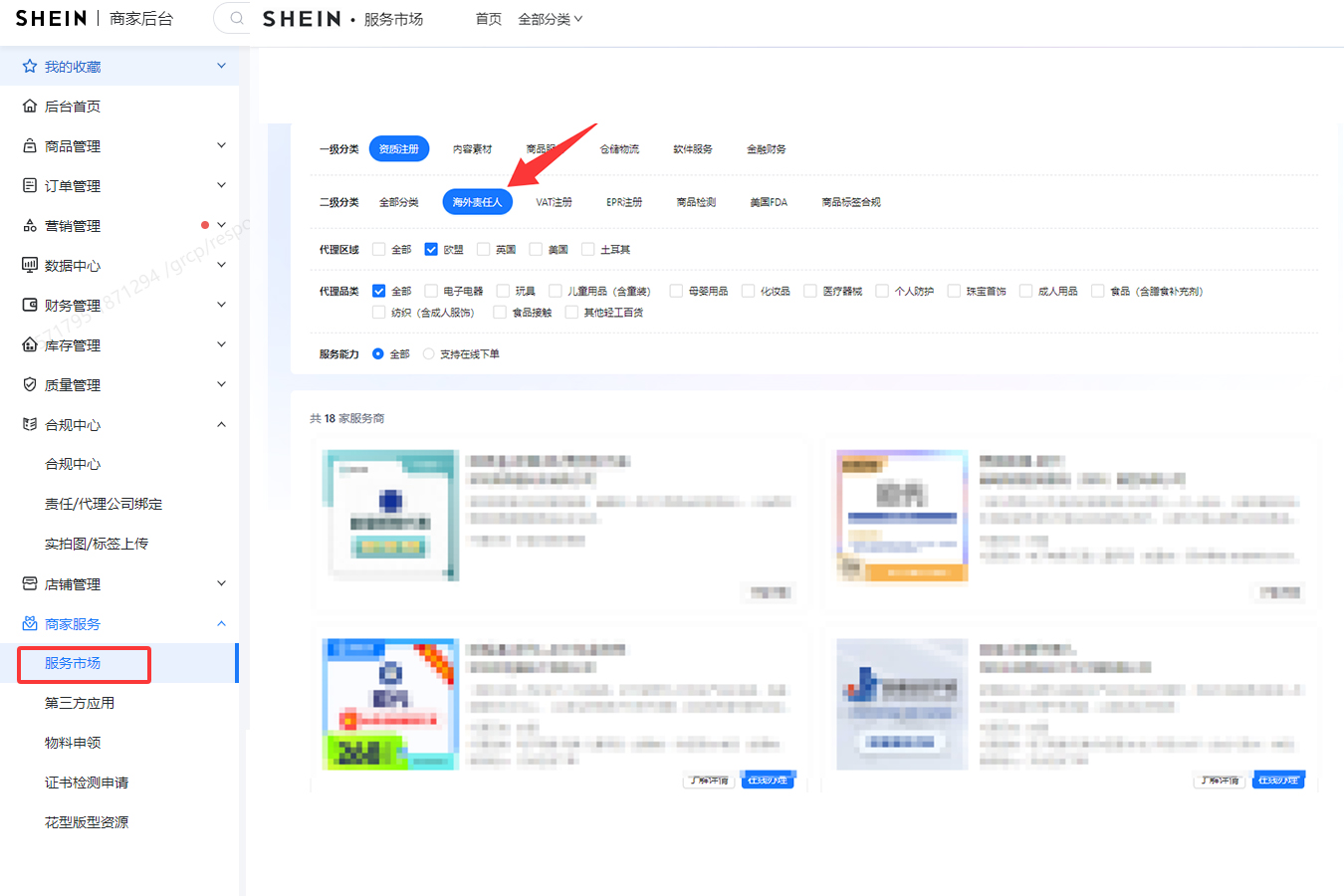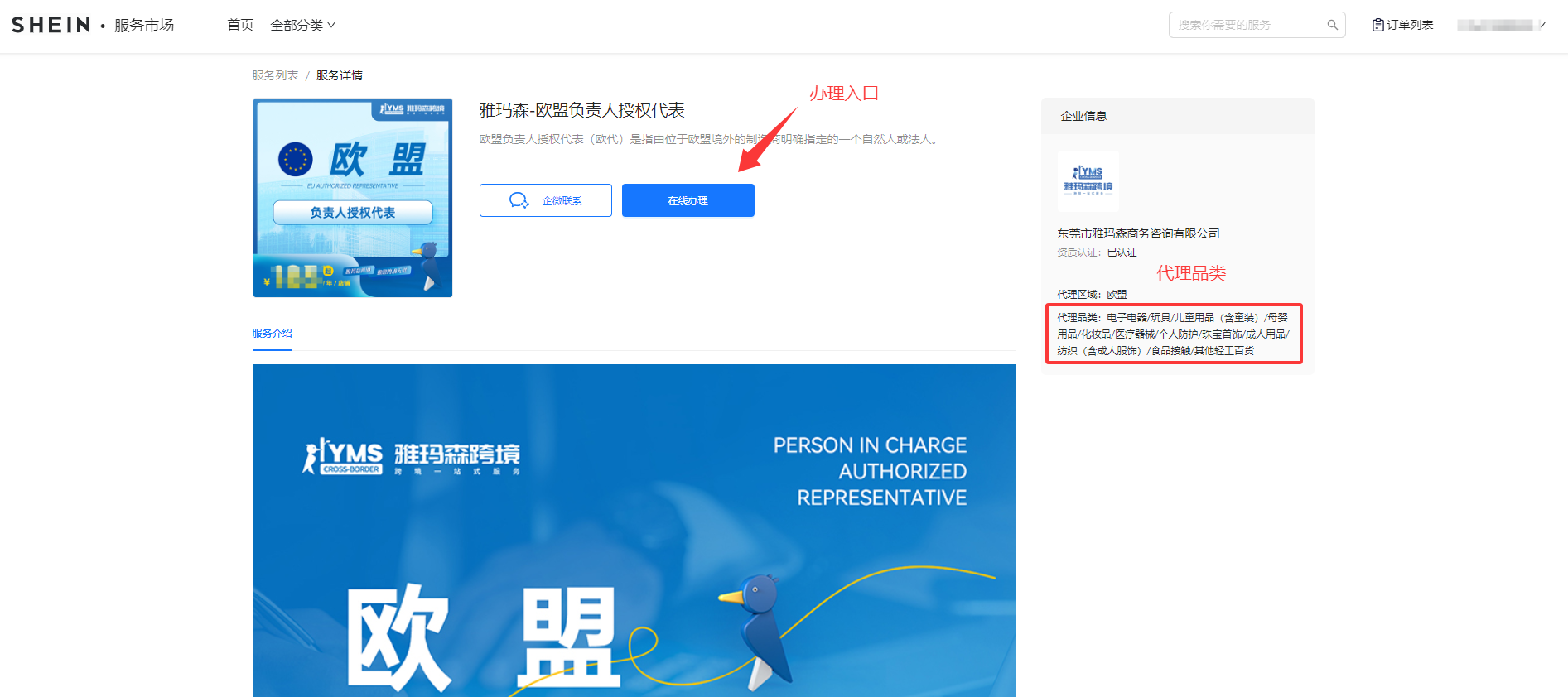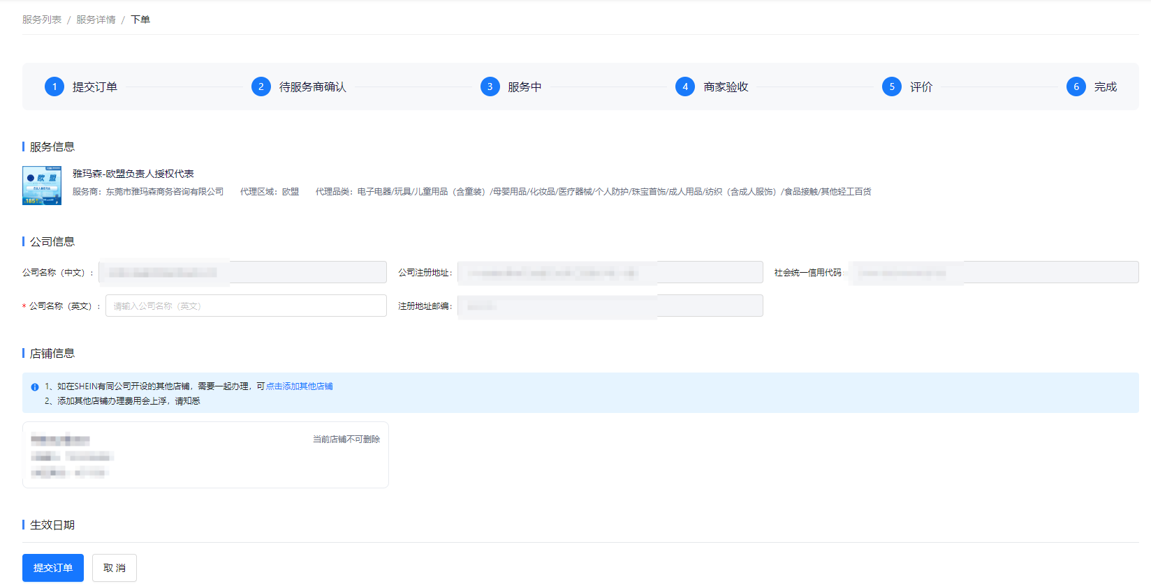 第1步:进入下单页(在线办理欧代的入口共有三个) 入口 ①:【商家后台】-【合规中心】-【责任/代理公司绑定】-【公司申报】-【在线办理代理协议】 入口 ③:商家后台】-【商家服务】-【服务市场】-选择资质注册、海外责任人 第2步:填写公司及店铺信息 在线下单页面需要商家填写公司信息、店铺信息。 注意事项: 公司信息 1.系统会优先自动读取店铺关联的公司信息,并预填在下单页面中,为避免信息错误导致最终办理的协议无效,所有预填信息均不支持修改; 2.英文公司名称,需商家手动填写,请确保正确翻译后填写,需要与中文公司名称,即SHEIN开店的公司一致; 3.特殊情况下,若系统未查询到相关信息,中文公司名称、注册地址、邮编和统一信用代码等信息,需要商家手动填写,请务必确保正确填写,避免影响业务办理。 店铺信息 1.若商家在SHEIN平台开有多个店铺,系统支持商家一次下单,同时办理多个店铺的协议,可点击「添加其他店铺」,选中其余店铺一起参与办理; 2.添加其他店铺时,只能勾选同一公司名称下的店铺,若开店主体名称不同,则无法一起办理; 第3步:填写协议生效时间、代理商品范围、联系人信息 如果商家此时还未发品,选择全部商品。欧代线下联系商家时,商家可同步后续店铺中预计售卖的商品类目信息。后续绑定SKC后,欧代仍会审核SKC是否代理。 注意事项: 协议生效时间 1.商家需要明确新协议的生效日期,服务商办理时,会根据商家的预期生成协议文件 2.页面中支持商家查看,相关店铺目前正处于生效中的代理公司和协议有效期,供商家参考。 代理商品范围 1.商家可以选择需要服务商代理的商品范围,支持选择所有商品,也支持商家按商品销售状态添加; 2.服务商办理时,会核对相关商品的信息,判断是否可以承接代理。 第4步:提交及查看订单状态 前3步信息填写并确认后可点击提交,信息将会同步至服务商系统。商家可通过【订单列表】查看已提交订单状态。 *订单状态可分为:待办理、待验收、已完结、已关单。 第5步:验收及应用协议 服务商完成协议办理及上传后,商家可在服务市场-【订单列表】查看【待验收】状态的订单,确认信息无误后,商家可点击【应用到合规中心】,系统将会自动将代理协议、代理绑定同步至后台合规系统中,无需商家再手动处理。 注意事项: 验收注意事项 1.协议有效期:请核对服务商提供的有效期,若有效期与双方约定的日期不符,请联系服务商及时处理; 2.代理商品范围:请商家重点关注一下,服务商标明其不能代理的商品有哪些,这部分商品,商家需要另行联系其他服务商办理代理协议,若与双方约定的代理范围不一致,请及时联系服务商处理。 服务评价 验收通过后,订单状态会更新为「已完结」,商家可针对该状态的订单,提交对订单和服务的评价,反馈该服务商的服务质量、办理效率。
