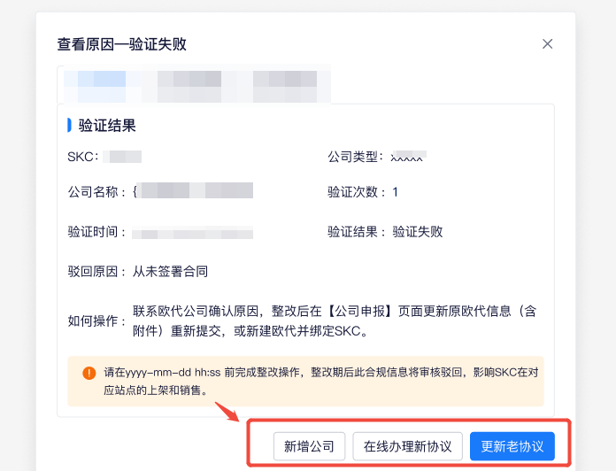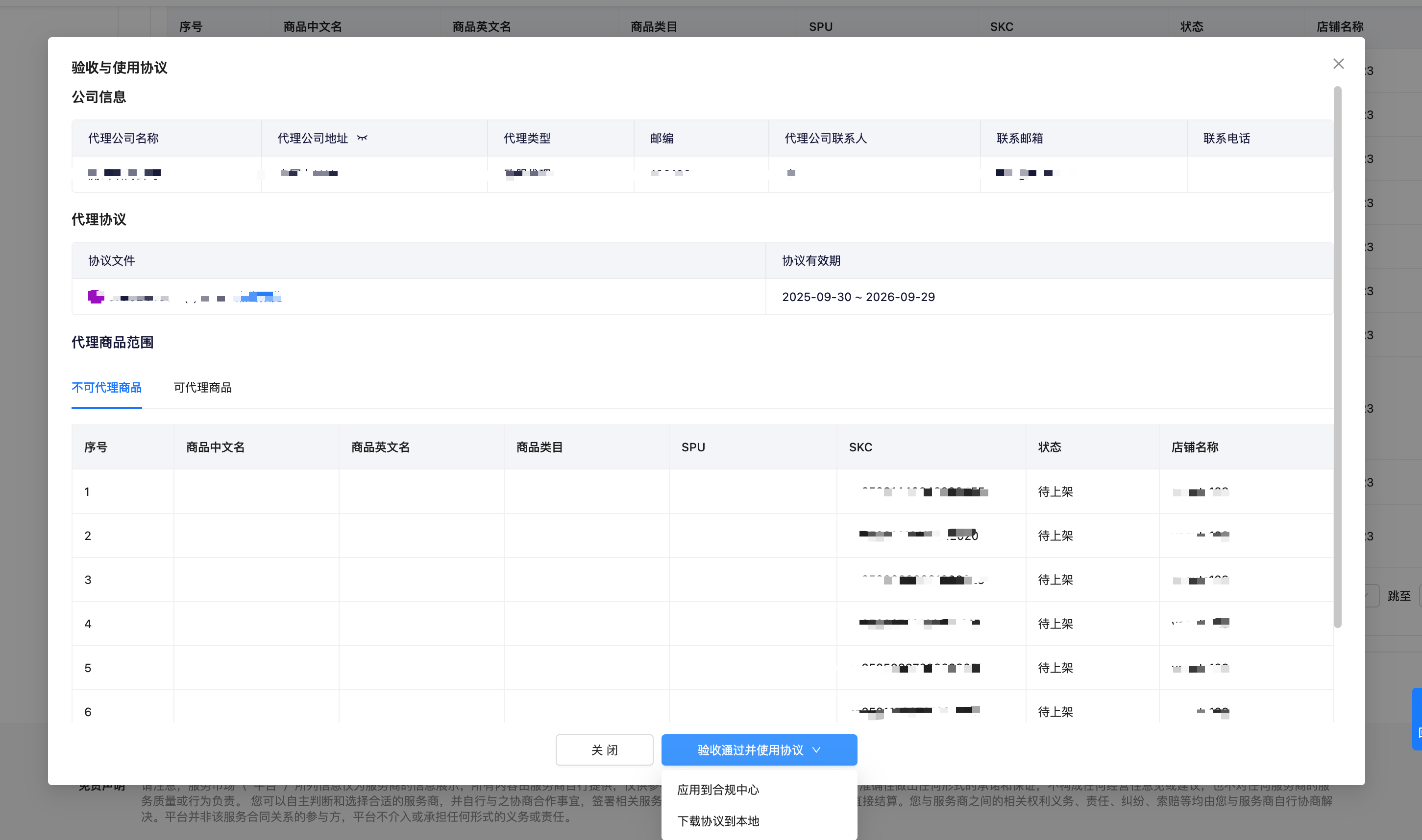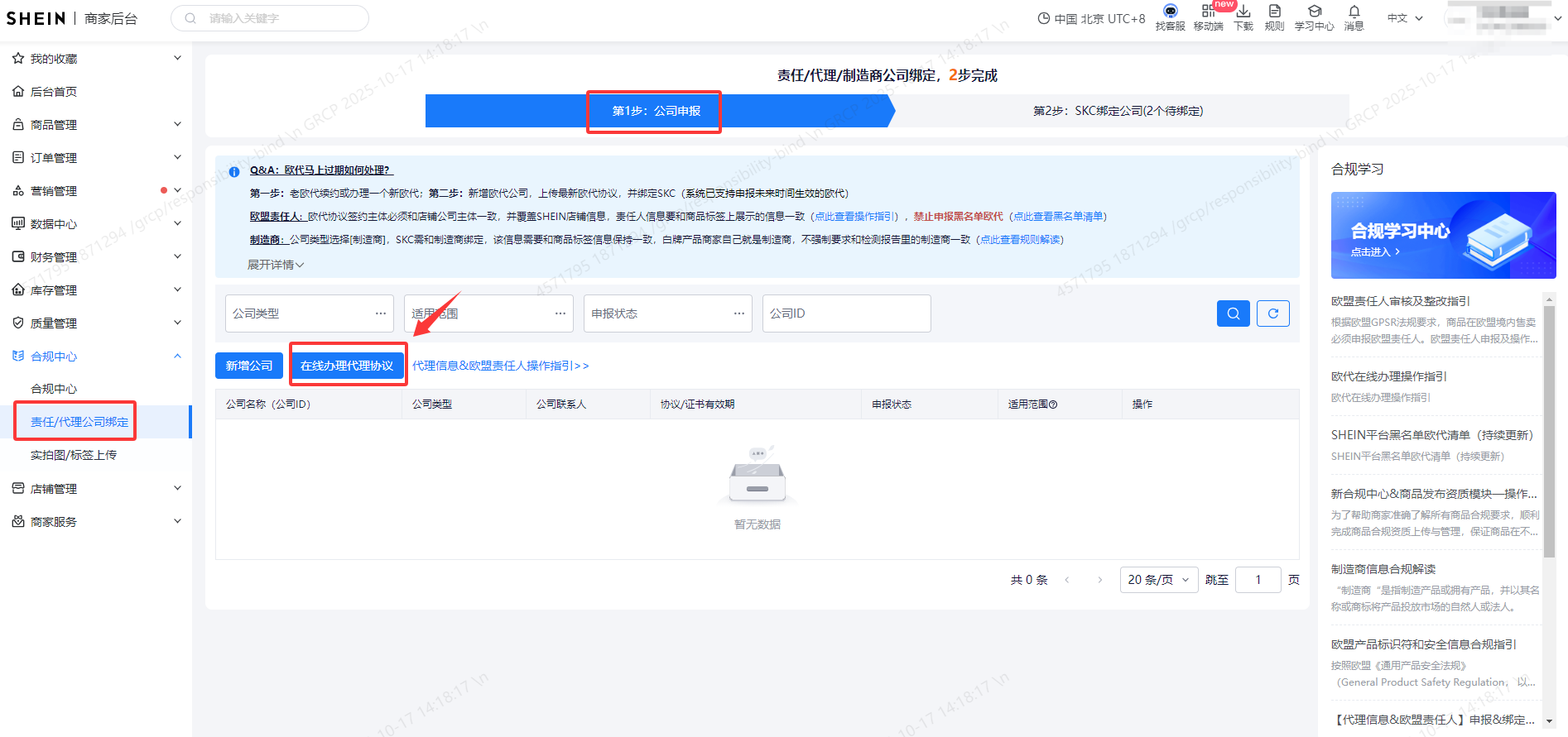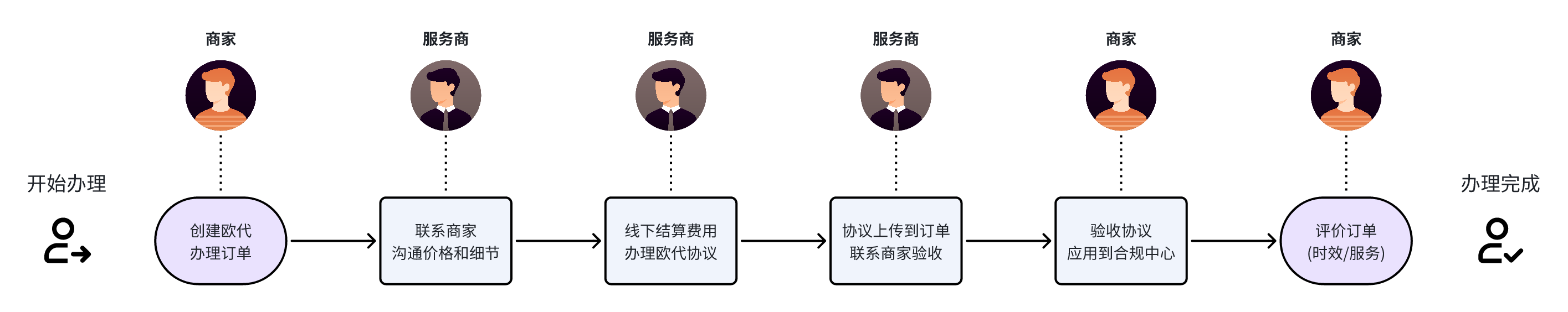 第1步:进入下单页(在线办理欧代的入口共有三个) 入口 ①:【商家后台】-【合规中心】-【责任/代理公司绑定】-【公司申报】-【在线办理代理协议】 入口 ③:商家后台】-【商家服务】-【服务市场】-选择资质注册、海外责任人 第2步:填写公司及店铺信息 在线下单页面需要商家填写公司信息、店铺信息。 注意事项: 公司信息 1.系统会优先自动读取店铺关联的公司信息,并预填在下单页面中,为避免信息错误导致最终办理的协议无效,所有预填信息均不支持修改; 2.英文公司名称,需商家手动填写,请确保正确翻译后填写,需要与中文公司名称,即SHEIN开店的公司一致; 3.特殊情况下,若系统未查询到相关信息,中文公司名称、注册地址、邮编和统一信用代码等信息,需要商家手动填写,请务必确保正确填写,避免影响业务办理。 店铺信息 1.若商家在SHEIN平台开有多个店铺,系统支持商家一次下单,同时办理多个店铺的协议,可点击「添加其他店铺」,选中其余店铺一起参与办理; 2.添加其他店铺时,只能勾选同一公司名称下的店铺,若开店主体名称不同,则无法一起办理; 第3步:填写协议生效时间、代理商品范围、联系人信息 如果商家此时还未发品,选择全部商品。欧代线下联系商家时,商家可同步后续店铺中预计售卖的商品类目信息。后续绑定SKC后,欧代仍会审核SKC是否代理。 注意事项: 协议生效时间 1.商家需要明确新协议的生效日期,服务商办理时,会根据商家的预期生成协议文件 2.页面中支持商家查看,相关店铺目前正处于生效中的代理公司和协议有效期,供商家参考。 代理商品范围 1.商家可以选择需要服务商代理的商品范围,支持选择所有商品,也支持商家按商品销售状态添加; 2.服务商办理时,会核对相关商品的信息,判断是否可以承接代理。 第4步:提交及查看订单状态 前3步信息填写并确认后可点击提交,信息将会同步至服务商系统。商家可通过【订单列表】查看已提交订单状态。 *订单状态可分为:待办理、待验收、已完结、已关单。 第5步:验收及应用协议 服务商完成协议办理及上传后,商家可在服务市场-【订单列表】查看【待验收】状态的订单,确认信息无误后,商家可点击【应用到合规中心】,系统将会自动将代理协议、代理绑定同步至后台合规系统中,无需商家再手动处理。 注意事项: 验收注意事项 1.协议有效期:请核对服务商提供的有效期,若有效期与双方约定的日期不符,请联系服务商及时处理; 2.代理商品范围:请商家重点关注一下,服务商标明其不能代理的商品有哪些,这部分商品,商家需要另行联系其他服务商办理代理协议,若与双方约定的代理范围不一致,请及时联系服务商处理。 服务评价 验收通过后,订单状态会更新为「已完结」,商家可针对该状态的订单,提交对订单和服务的评价,反馈该服务商的服务质量、办理效率。
