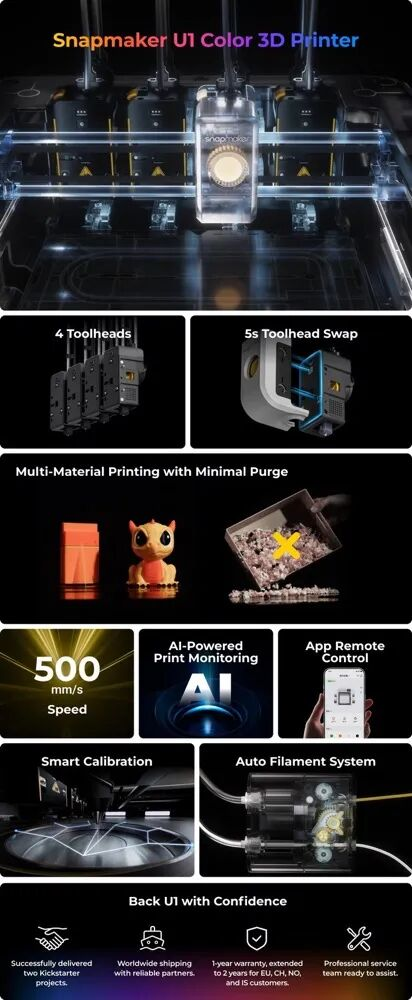 在KickStarter上,Snapmaker的页面科技感十足。核心亮点包括4工具头、5秒工具头转换、多材料低损耗打印、AI打印监控、APP控制、高速智能等。
