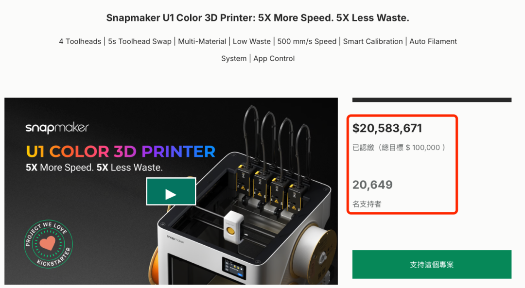 快造科技旗下品牌Snapmaker,众筹上线U1彩色3D打印机,上线12小时即拿下670万美金(4700万人民币)。原定9月30日截止的项目,到10月13日仍然可以认缴。20649名众筹者,2058万众筹金额,使得Snapmaker U1成为Kickstarter募资金额最高的3D打印机项目。