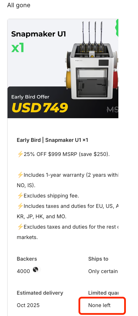 此次Snapmaker U1提供的众筹套餐从749美金起步,最高额的套餐为1498美金,交付时间为2025年10月-11月。仅仅发布了一天,在10月早鸟交付的749美金套餐,已经全被抢完,支持者高达4000人。可见产品的吸引力和品牌的运营能力都非常到位。