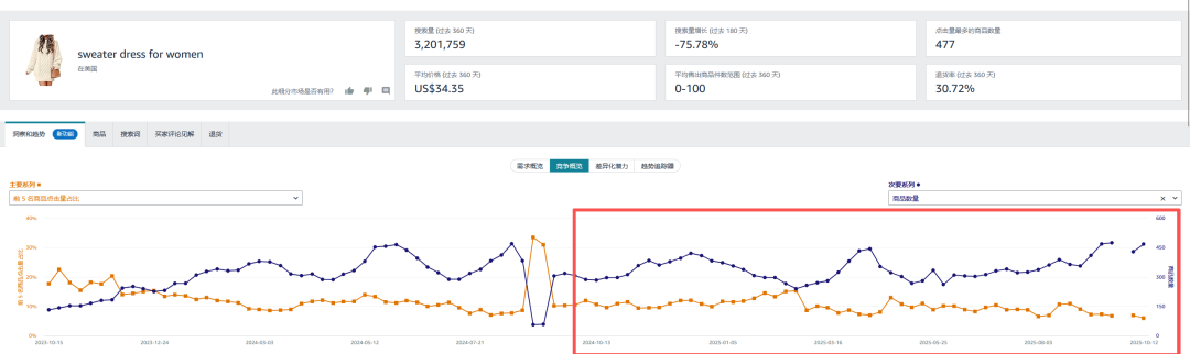 判断卖家当前品类的选择是否正确,不仅要看它的市场容量够不够大,更要看它是处在上升通道,还是萎缩状态。在这里,Amanda巧用商机探测器,并在其中输入“sweater dress”,获取这一类目的细分市场趋势。