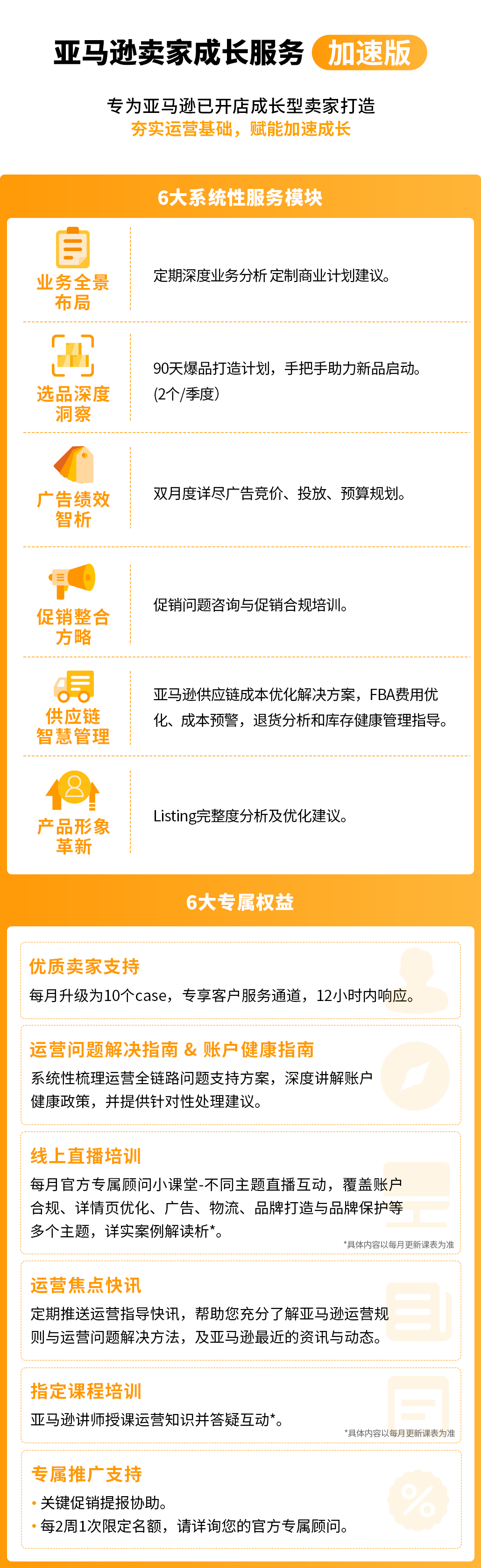 加入亚马逊卖家成长服务,您还将获得官方专属顾问提供的1对1个性化品牌提升方案,涵盖: