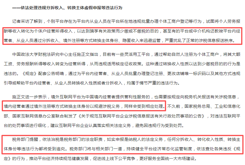 一是 部分平台为从业者批量办个体户登记转换收入性质,中介教唆经营者借境外注册、分拆收入避税,税务部门重申此类违法行为必被追究;