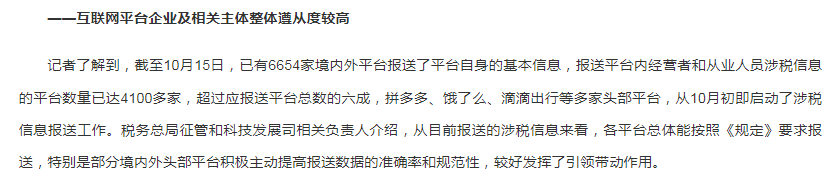 早在今年6月,国务院就发布了《互联网平台企业涉税信息报送规定》,要求平台企业在10月31日前首次向税务部门正式报送境内经营者的身份信息、收入数据等。根据税务局公布的申报税务信息的最新进展:截至10月15日,已有6654家境内外平台完成自身信息报送,报送平台内经营者和从业人员涉税信息的平台数量已达4100多家,超过应报送平台总数的六成。