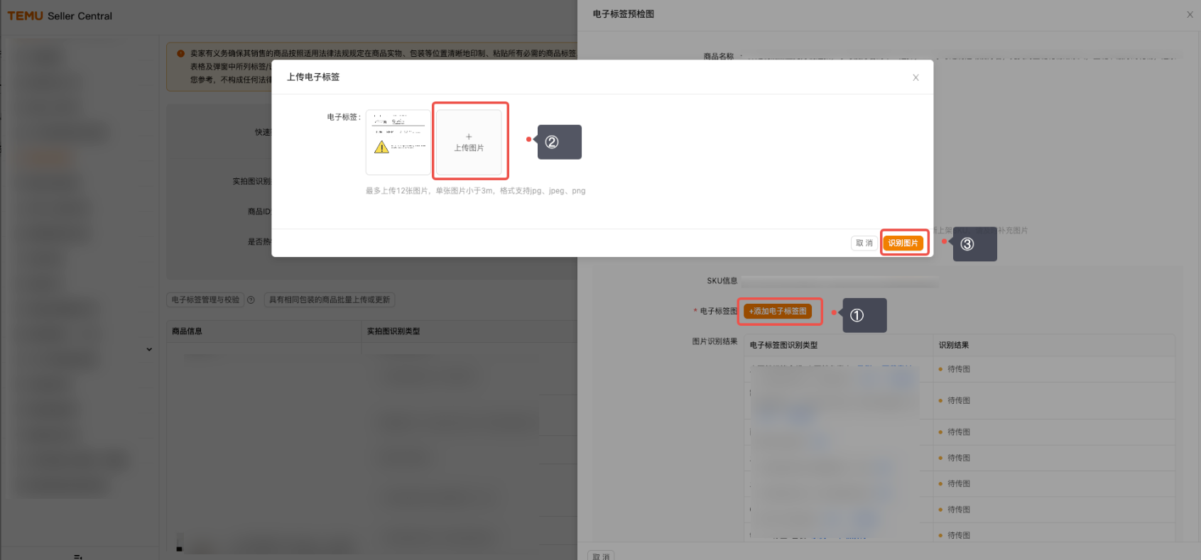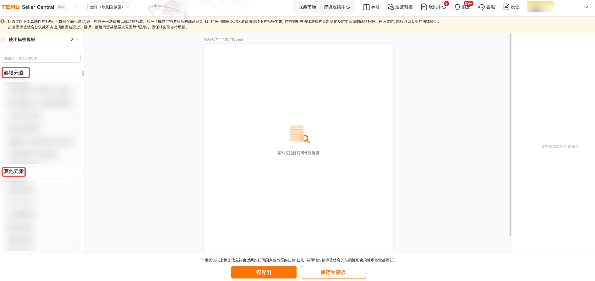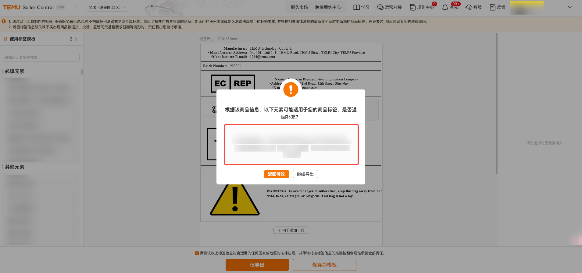 (一)进入TEMU卖家中心,点击【合规服务】,点击【打印商品合规标签】。 (二)请找到您需要制作标签的商品,点击其旁的【制作标签】按钮,并根据实物选择好标签尺寸,确认后即可进入制作界面。 (三)进入标签制作界面后,请根据商品实际情况,核实左侧推荐的【必填元素】是否适用。如适用,请将【必填元素】完整展示在商品标签中,并可参考【合规中心-商品实拍图】板块的提示进行制作。请注意,页面信息仅供参照,除了系统推荐的【必填元素】外,商品可能还有其他适用的标签信息。 (四)标签制作完毕后,您需勾选“自我责任声明”,选择“保存为模板”或“仅导出”。 点击“保存为模板”:本次编辑的商品标签自动存为模板,以便后续使用。 点击“仅导出”:可下载本次制作的商品标签。 (五)点击【仅导出】后,系统会在下方红框处为您再次推荐可能适用的标签信息。请您仔细核对,确认无误后点击【继续导出】;如需调整,则可点击【返回修改】。点击【继续导出】,可完成本次制作的电子版商品标签下载。 (六)电子版标签下载完毕后,返回至【打印商品合规标签】界面。找到相关商品后,点击【去上传】。 (七)进入“去上传”界面后,点击【添加电子标签图】--【上传图片】--【识别图片】。注:此处上传的图片为您制作的电子版商品标签。 (八)完成上述“二(七)”步骤操作后,您可根据“标签识别有异常”提示,返回商品标签制作工具,添加或修改识别异常的标签信息。 (九)完成上述全部操作后,您可将电子版商品标签打印为纸质商品标签。 以上内容来源Temu卖家课堂。