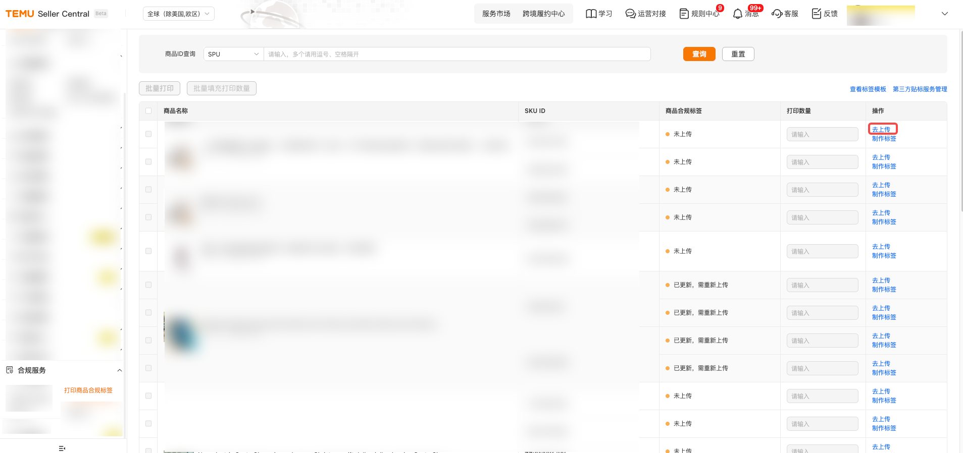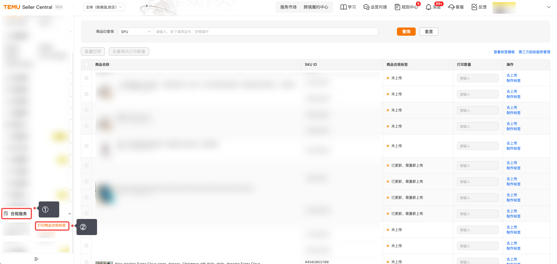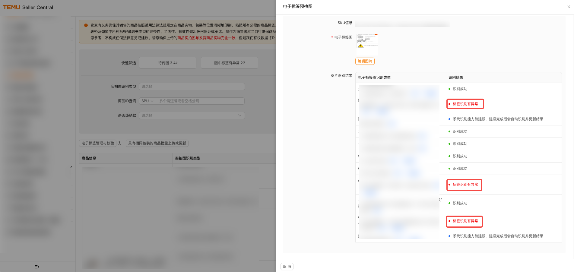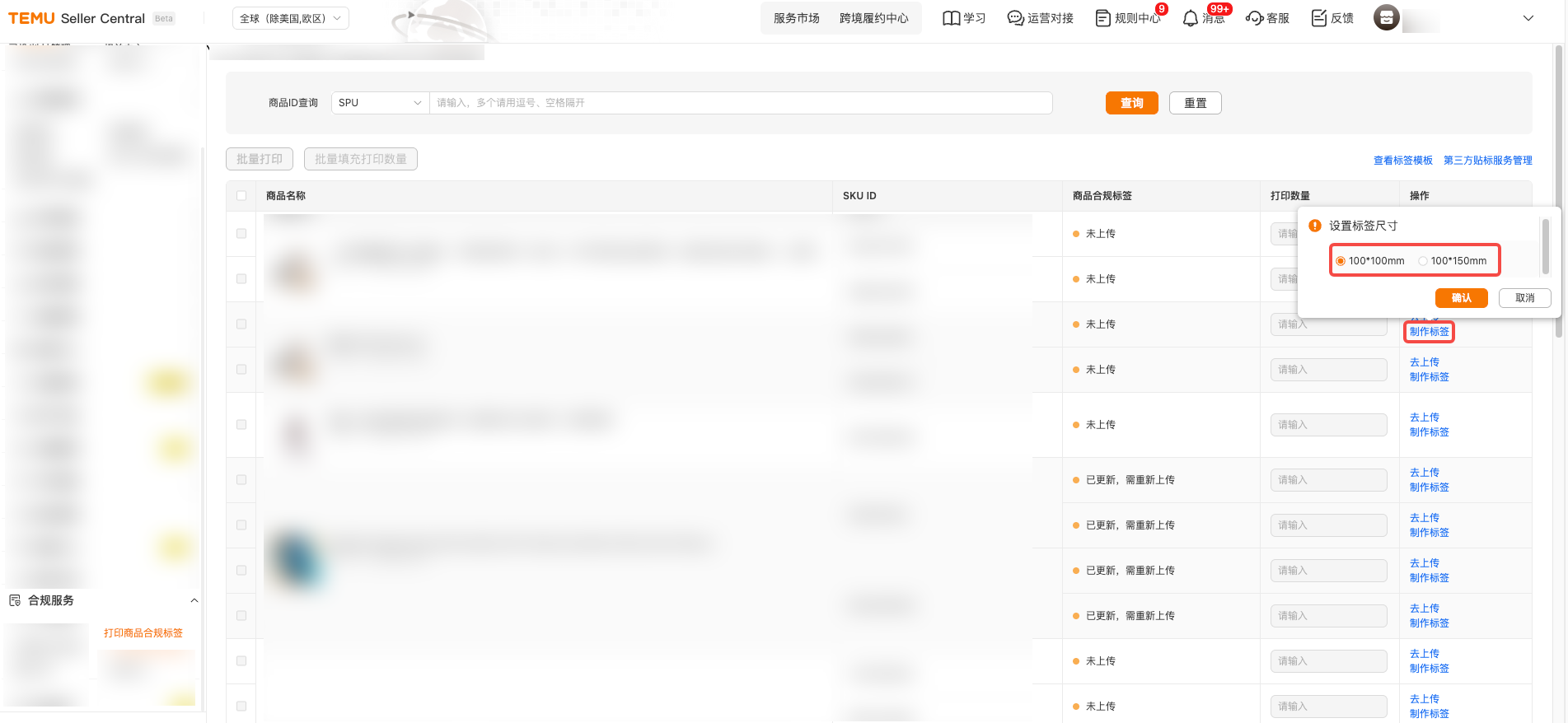 (一)进入TEMU卖家中心,点击【合规服务】,点击【打印商品合规标签】。 (二)请找到您需要制作标签的商品,点击其旁的【制作标签】按钮,并根据实物选择好标签尺寸,确认后即可进入制作界面。 (三)进入标签制作界面后,请根据商品实际情况,核实左侧推荐的【必填元素】是否适用。如适用,请将【必填元素】完整展示在商品标签中,并可参考【合规中心-商品实拍图】板块的提示进行制作。请注意,页面信息仅供参照,除了系统推荐的【必填元素】外,商品可能还有其他适用的标签信息。 (四)标签制作完毕后,您需勾选“自我责任声明”,选择“保存为模板”或“仅导出”。 点击“保存为模板”:本次编辑的商品标签自动存为模板,以便后续使用。 点击“仅导出”:可下载本次制作的商品标签。 (五)点击【仅导出】后,系统会在下方红框处为您再次推荐可能适用的标签信息。请您仔细核对,确认无误后点击【继续导出】;如需调整,则可点击【返回修改】。点击【继续导出】,可完成本次制作的电子版商品标签下载。 (六)电子版标签下载完毕后,返回至【打印商品合规标签】界面。找到相关商品后,点击【去上传】。 (七)进入“去上传”界面后,点击【添加电子标签图】--【上传图片】--【识别图片】。注:此处上传的图片为您制作的电子版商品标签。 (八)完成上述“二(七)”步骤操作后,您可根据“标签识别有异常”提示,返回商品标签制作工具,添加或修改识别异常的标签信息。 (九)完成上述全部操作后,您可将电子版商品标签打印为纸质商品标签。 以上内容来源Temu卖家课堂。