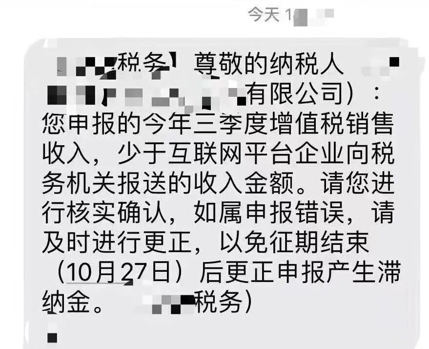 尊敬的纳税人:您申报的今年三季度增值税销售收入,少于互联网平台企业向税务机关报送的收入金额。请您进行核实确认,如属申报错误,请及时进行更正,以免征期结束(10月27日)后更正申报产生滞纳金。