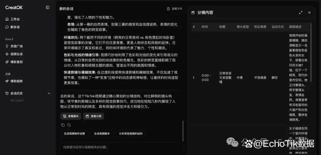 【示例】在EchoTik数据找到9月美国站热门带货视频榜Top 1之后,复制TikTok视频链接并粘贴至CreatOK,AI将自动展开对该视频的分析,并自动提取分镜和脚本。