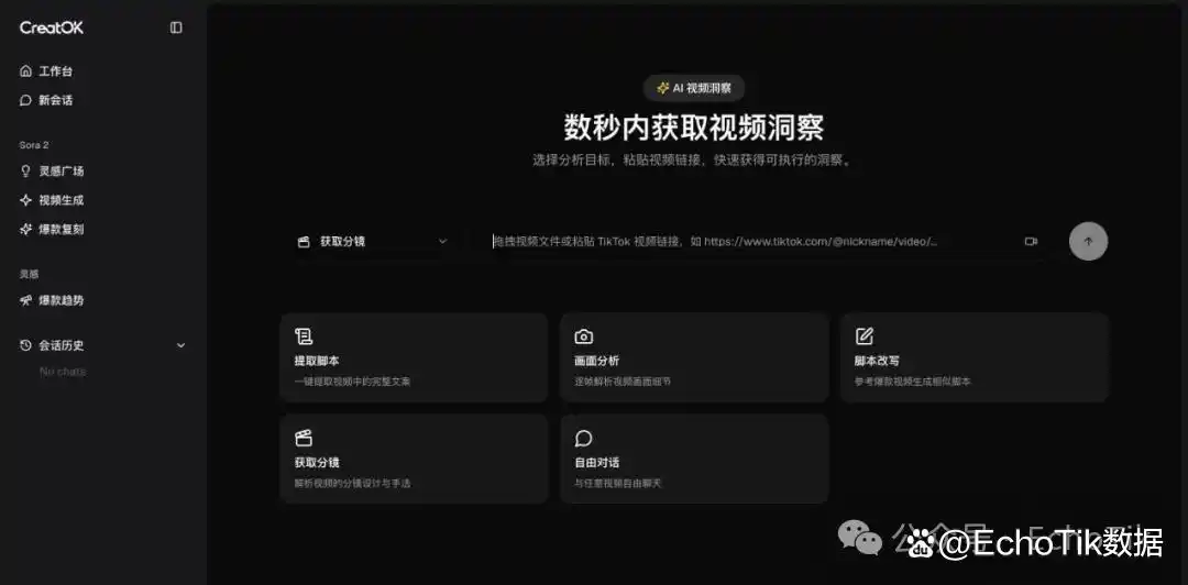 ② 拖拽本地视频文件,或粘贴TikTok视频链接,即可一键提取脚本和分镜,以及画面分析,并支持针对该视频与AI展开自由对话和定制化需求。