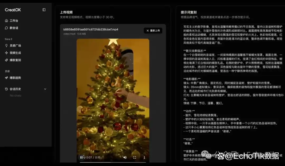 【示例】为了迎战圣诞季促销,您可以找到过往的圣诞节热门视频素材,上传至此处,提取脚本和描述,再经AI视频生成属于您的版本。