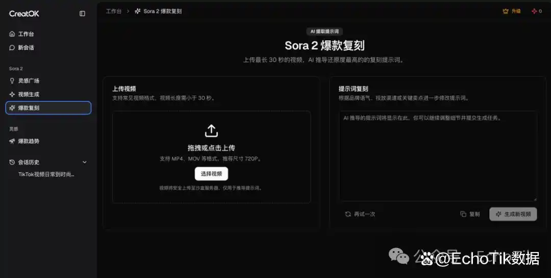 此外,如果您想要定向分析某条视频,也可以点击左侧工具栏「爆款复刻」,上传本地不超过30秒的视频后,AI将帮助您推导还原度最高的复刻提示词,协助您完成脚本设计。