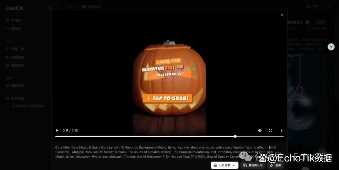 【示例】万圣节即将来临,我想要为南瓜灯制作一个15秒的带货视频,在文本中添加了对画面风格、声效还有文字的要求,并选择风格为「产品展示」。