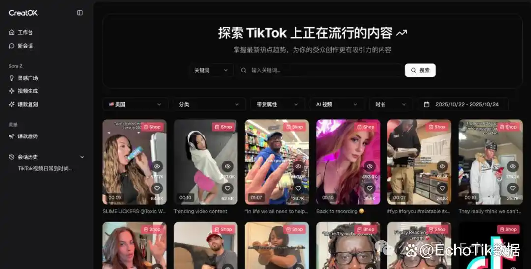 ③ 在左侧工具栏的「爆款趋势」,您可以找到部分热门的TikTok视频,支持多国家站点、分类、是否带货、是否AI创作、时长、时间段等多个筛选项。