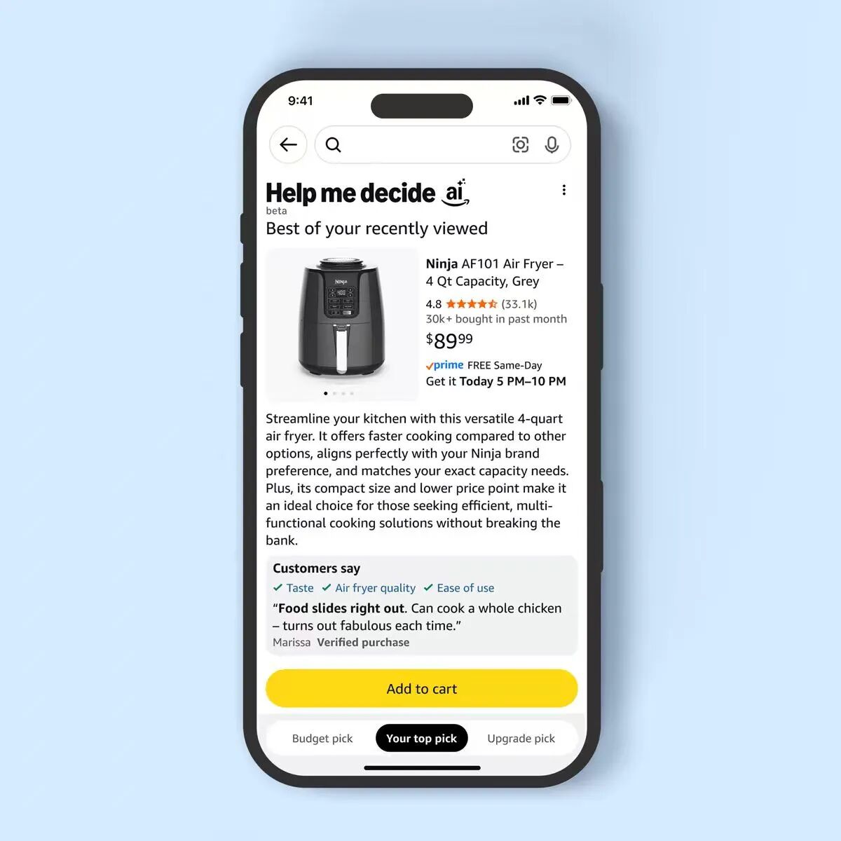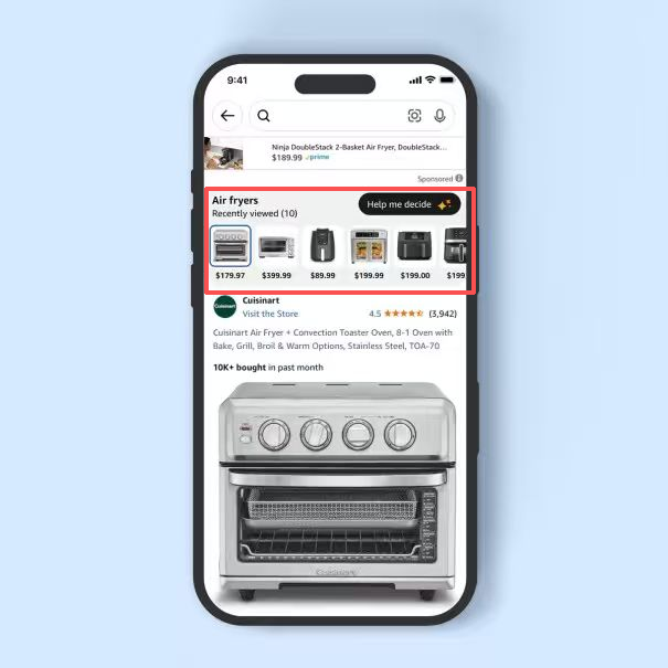 简单来说,这是一个“AI决策助手”。当用户在同类商品中反复浏览几件类似产品但迟迟不购买时,页面顶部会出现一个“帮我决定(Help Me Decide)”按钮。点击后,系统自动分析买家最近的浏览记录、搜索关键词、历史购买记录、偏好类别和消费层级。