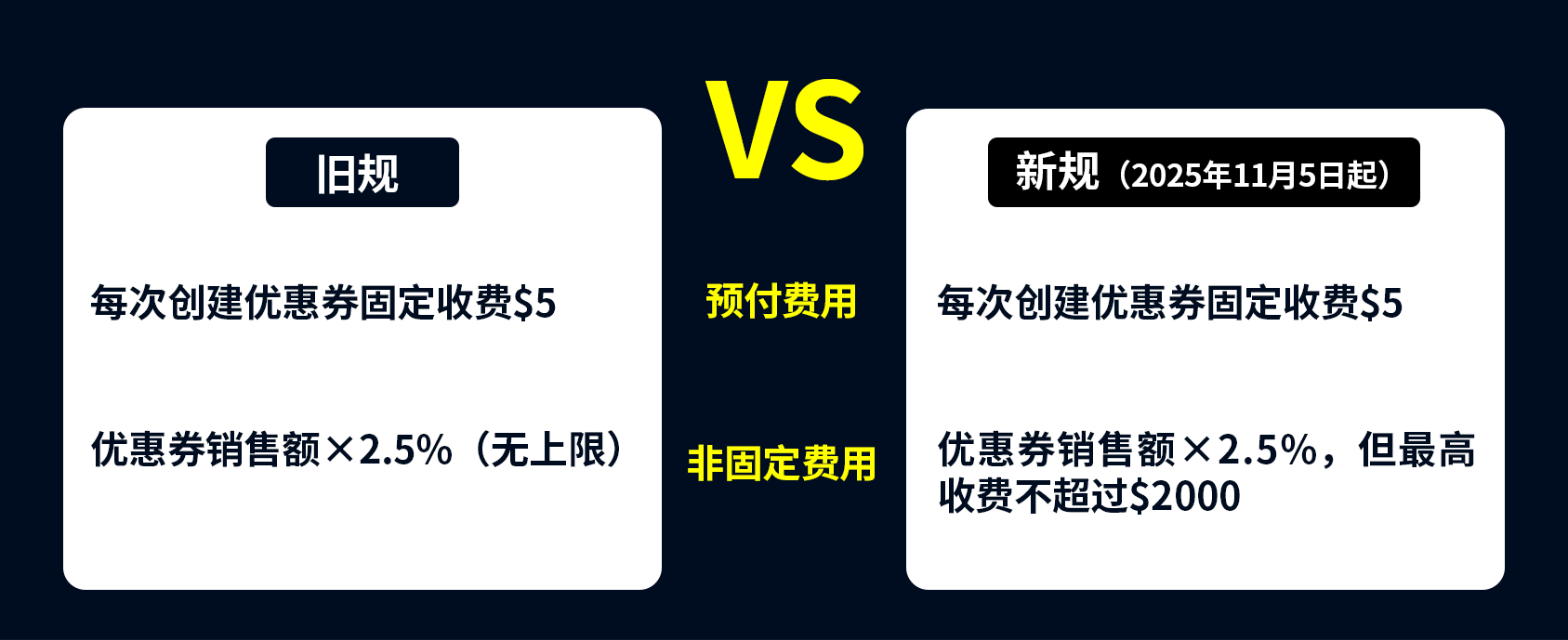 也就是说,如果卖家在11月5日前创建的优惠券,即便活动时间涵盖黑五网一,依旧按旧规收费,成本上不封顶!