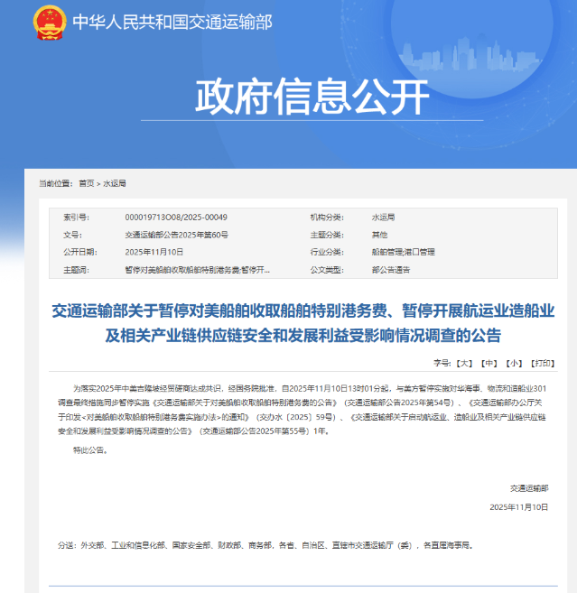 为落实2025年中美吉隆坡经贸磋商达成共识,经国务院批准,自2025年11月10日13时01分起,与美方暂停实施对华海事、物流和造船业301调查最终措施同步暂停实施《交通运输部关于对美船舶收取船舶特别港务费的公告》(交通运输部公告2025年第54号)、《交通运输部办公厅关于印发<对美船舶收取船舶特别港务费实施办法>的通知》(交办水〔2025〕59号)、《交通运输部关于启动航运业、造船业及相关产业链供应链安全和发展利益受影响情况调查的公告》(交通运输部公告2025年第55号)1年。