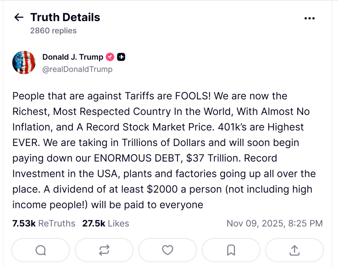 前脚刚传出“10% 芬太尼关税取消、24% 关税继续暂停”的好消息,后脚特朗普就在社交平台上喊话——要用关税收入给美国人发钱。