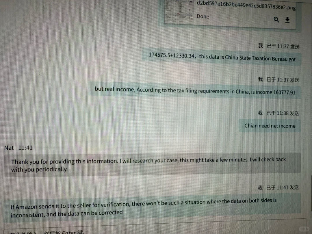 因为账差太大,她随即开 case 向亚马逊客服询问。在对话中,该卖家多次强调中国是按净额申报,但客服的回复很直接——平台推送过去的,是gross sales(毛收入)。后台的net income,并不在推送之列。